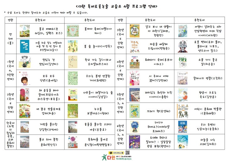 안녕하세요! 다원 독서토론논술입니다. 본격적인 봄을 알리는 4월이에요. 거리 곳곳에서 꽃망울을 터트린 모습이 설레는 마음을 더합니다. 4월 수업 프로그램 안내할게요. 자세한 내용은 아래 사진을 참고하시고, 수업 문의는 전화나 카카오톡 1:1 채팅으로 연락해 주세요! 전화 : 031) 423-4778 카카오톡 1:1 채팅 : http://pf.kakao.com/_fByWd/chat <img src="https://blogthumb.pstatic.net/MjAyNjA0MDNfMjUy/MDAxNzc1MTkwNjgxMDQw.-RipRwat8igQiACgQXnggVH6I98tc_mm8WqkcjeuYv8g.A9y6WLoaOiBYJPRZN10tq_OeiHBQW9o_BTVj8_5Ev_Qg.JPEG/2026-04001.jpg?type=s3" />