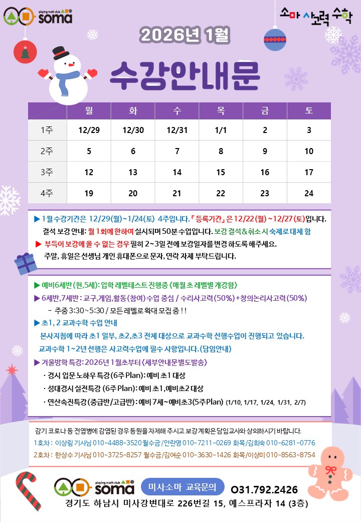 [미사수학] 미사소마 사고력수학 26년 1월 개강 안내문