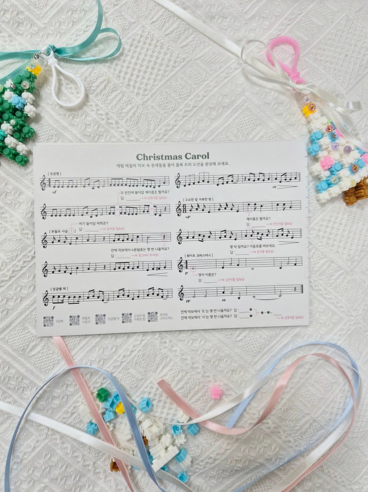 12월 예술융합특강 안녕하세요 음악이 즐거워지는 아이러브음악학원 입니다. 12월 예술융합특강에서는 ☃️아이들이 가장 좋아하는 크리스마스 활동을 했어요. 음악문제 풀기부터 블럭 아트까지!! 모두가 신나는 시간이었습니다. 캐롤 매들리 악보를 보고 리듬 음이름 기호를 활용한 간단한 문제를 풀어 보았어요. 음악요소를 눈으로 찾고 직접 써보면서 악보 읽기 능력을 키우는 시간이 되었답니다!! 문제를 모두 풀면 블럭 트리 도안이 만들어 집니다. 도안을 따라 미니 크리스마스트리를 직접 만들어 보았습니다. 아기자기하고 예쁜 작품들이 완성 됐어요.!! 리본과 키링 고리까지 연결하여 완성!! 집중해서 활동....... <img src="https://blogthumb.pstatic.net/MjAyNTEyMTVfMTIz/MDAxNzY1Nzc2MjkzMTkw.KBgIs15ijGy17ht2Ou5a683PMQpFSOBrwnRVCLtfZT4g.i4p59hAszHPdznAFHky2V2ZsLV_lL1ppJVpr2J1E0bkg.JPEG/KakaoTalk_20251212_140428305_01.jpg?type=s3" />