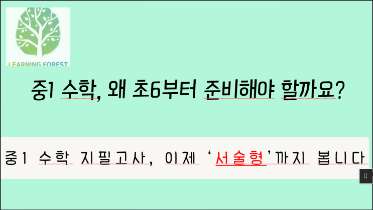 중학교 때 수학이 어려워진다는데요. 초등학교 때부터 준비해야 하나요?? 초등학교 학부모님께서 자주 물어보시는 질문입니다. 제 대답은 "네!" 입니다. 초등수학 개념을 확실히 다지고, 적절한 시기에 준비하여, 부족한 부분을 파악하고, 빈틈있는 부분을 집중보강해야 합니다! 게다가 2024년도부터 중1 자유학기제가 점점 축소되고 학교마다 중간,기말고사에서 논술형/서술형 문제 출제 비중이 늘어나고 있습니다. 논술형/서술형 문제는 잘 훈련되지 않으면 어떻게 써야할지 당황할 수 있습니다. 배움의 숲에서 제대로 준비합시다~! <img src="https://blogthumb.pstatic.net/MjAyNjAyMDVfMTQx/MDAxNzcwMjY3NDAxMzc0.-uI39kmJpvPC-DkTc5Ywbdhu4DG3ARoOdm3djlN90j0g.NNwyTXvcQ1LxoYNDuIsFdOjPehuQzIwcogA1ni35dogg.PNG/image.png?type=s3" />