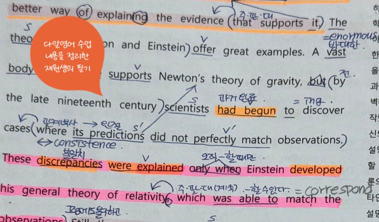 저희 다알영어에서는 수업 이후의 학습 과정을 중요하게 관리합니다. 수업 중 핵심 개념을 정리하고, 문제 풀이를 통해 이해도를 점검한 뒤 틀린 문제는 반드시 오답 정리로 연결합니다. 이러한 반복 학습을 통해 학생들은 자신의 약점을 정확히 파악하고 실수를 줄여 나갈 수 있습니다. 단순히 많은 문제를 푸는 것보다 한 문제를 정확히 이해하는 것이 실력 향상의 핵심입니다. ↑ ↑ ↑ 위 사진 속 필기는 수업 중 다알영어 원생이 직접 필기한 내용과 문제 풀이 흔적, 그리고 틀린 문제에 대한 오답 정리가 함께 담긴 학습 기록입니다. 중요한 핵심 문장은 형광펜으로 표시하고, 문장 구조나 해석이 어려운 부분은 여백에 따로 메모하며 이해....... <img src="https://blogthumb.pstatic.net/MjAyNTEyMjRfMTIw/MDAxNzY2NTcwMTE3ODA5.vIWcys4unqtbaMKMHc44-TZaouKBIanGac_Cip5nRSMg.vPQodt2I5wLHjjtJPbOnuey3K3Y8GflQoRv1wKWQGy8g.JPEG/KakaoTalk_20251224_183804933_02.jpg?type=s3" />