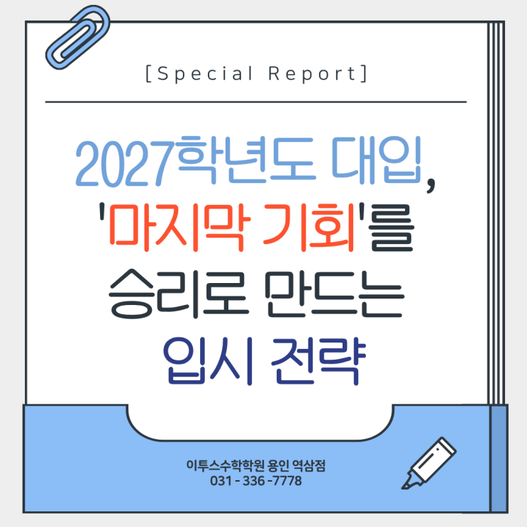 안녕하십니까, 이투스 수학학워 용인 역삼점입니다. 2027학년도 대입은 가장 치열하고도 정교한 전략이 필요한 해입니다. 2028학년도부터 수능 체제와 내신 평가 방식이 완전히 개편됨에 따라, 현재 고2 학생들에게 2027학년도는 '재수 없는 단판 승부'가 되어야 하기 때문입니다. 변화의 파도 속에서 길을 잃지 않도록, 10년 베테랑의 안목으로 2027 대입 핵심 포인트를 분석했습니다. 1. 2027 대입의 메가 트렌드: "안정 속의 격변" ① 의대 증원 및 무전공 선발의 '안착기' 2025~2026학년도에 시작된 의대 정원 확대와 무전공(자율전공) 선발 광풍이 2027학년도에는 하나의 시스템으로 안착합니다. 최상위권의....... <img src="https://blogthumb.pstatic.net/MjAyNTEyMjRfMTcz/MDAxNzY2NTgyNDEyOTU2.12hflvirJg-zkN5XghnNJATFbGCFqCtyCM-w4RJrUtcg.gurkrNLI1W_1Op6B3BZvty7ihYjOrQEUehr82R0ijJcg.PNG/%C1%A6%B8%F1%C0%BB_%C0%D4%B7%C2%C7%D8%C1%D6%BC%BC%BF%E4..png?type=s3" />