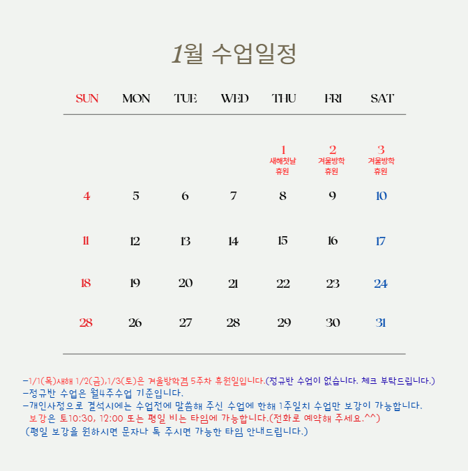 [끌레르아트 미술&도예학원] 겨울바람이 차갑습니다 가족모두 건강 잘 챙기시길 바랍니다. 1월 정규반 수업 일정표를 보내드립니다. ☀️12/29(월)-1/3(토)까지 겨울방학(5주차휴원)으로 미술학원 수업이 없습니다. (한주간 리뉴얼 공사기간을 거쳐 더 여유로운 공간에서 유익한 수업으로 만나보겠습니다.) ☀️정규반 수업은 월4주수업 기준입니다. ☀️개인사정으로 결석시에는 수업전에 말씀해 주신 수업에 한해 1주일치 수업만 보강이 가능합니다. 보강은 토10:30, 1:30 또는 평일 비는 타임에 가능합니다.(전화로 미리 예약해 주세요.^^) (평일 보강을 원하시면 문자나 톡 주시면 가능한 타임을 안내드립니다.) ☀️학원에 대기공간....... <img src="https://blogthumb.pstatic.net/MjAyNTEyMjhfMjYw/MDAxNzY2ODQ3ODM5MDI3.zv97mUk6hisgaz7YAnokPFRy37XKR_bYPk1xkZ2MxNwg.eELY7Y5oFslgl_0gsGniXk03m-PxEtwxPlXkC617PxQg.PNG/1766821389317.png?type=s3" />