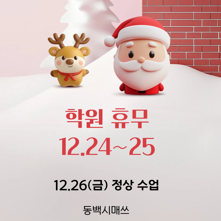 12.24~25 동백시매쓰 휴무입니다. (12.26(금) 정상등원) 학원 쉬는날이므로 방문, 전화,카톡상담이 안됩니다. 동탄시매쓰 친구들 성탄절 즐겁게 보내고 12.26(금) 건강한 모습으로 학원에서 다시 만나요! 입학테스트 온라인 예약 https://apply.cmath.co.kr/23071/dongbaek <img src="https://blogthumb.pstatic.net/MjAyNTEyMjNfMTcx/MDAxNzY2NDc5NTU1NzU3.yRC-nEr55HpL-eKydCzxfeCCzf40QxldLuOv-AUAyO0g.i52QlSGIIajxEAlYrxmMyh8MpSbUYINNUjC1dPZ9ozUg.PNG/%C1%A6%B8%F1%C0%BB_%C0%D4%B7%C2%C7%D8%C1%D6%BC%BC%BF%E4._%2840%29.png?type=s3" />