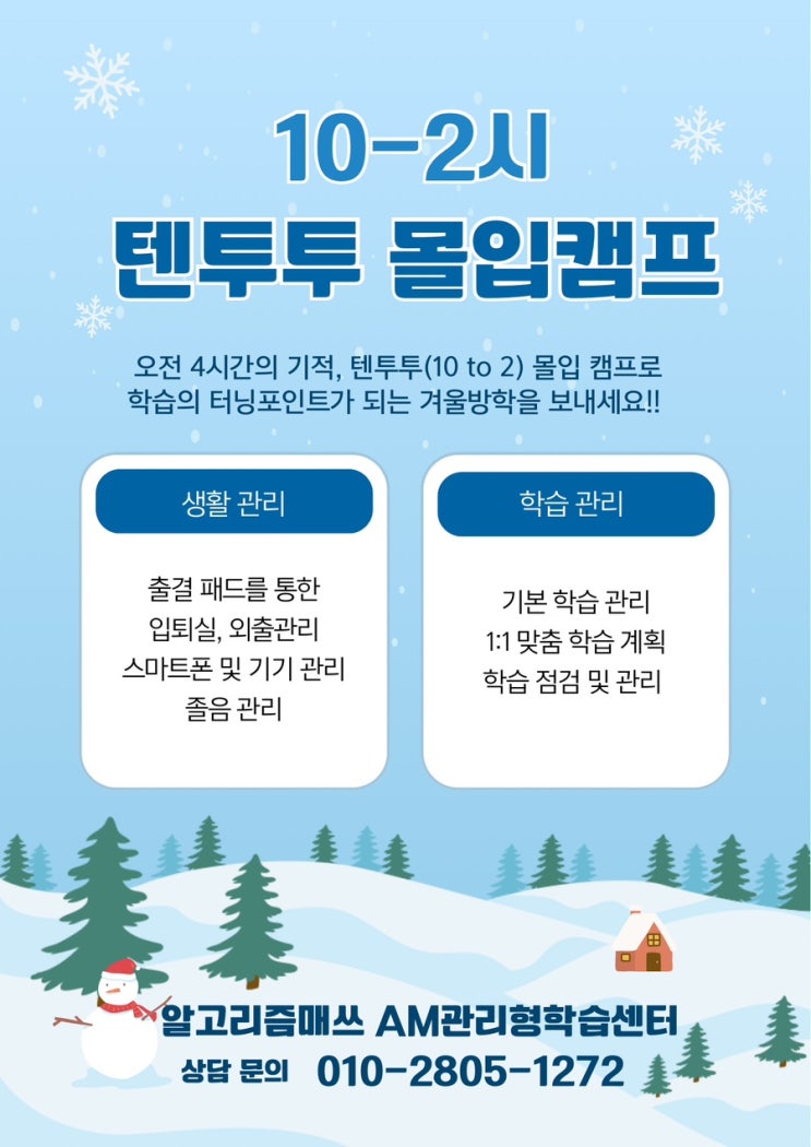 오전 4시간의 기적, 텐투투(10 to 2) 몰입 캠프 겨울방학, 우리 아이의 오전 10시는 어떤 모습인가요? 혹시 이불 속에서 스마트폰과 씨름하며 소중한 시간을 흘려보내고 있진 않나요? 추운 날씨, 늦은 기상, 그리고 눈 뜨자마자 손에 쥐는 스마트폰... 방학만 되면 반복되는 이 풍경이 학부모님들의 가장 큰 고민입니다. "오전 시간을 버리면, 그날 하루 공부는 이미 실패한 것과 다름없습니다. " 잠든 뇌를 깨우고 학습 리듬을 잡아야 하는 골든타임, [알고리즘매쓰 AM관리형 학습센터]가 오전 10시부터 오후 2시까지 완벽하게 책임집니다. 왜 하필 '오후 2시'까지인가요? (Short & Strong!) 종일 갇혀 있는 공부는 아....... <img src="https://blogthumb.pstatic.net/MjAyNTEyMzBfMTky/MDAxNzY3MDU2MDU0NjQ2.5LupEOE5icrscKKsK23PfkNSmzzpYqR4AGrIFW46oZQg.QbDjD-SY76oeRF7dTD0q8WUzEhGrRUfChFmZh4hcMicg.JPEG/%C7%CF%B4%C3%BB%F6_%B9%E8%B0%E6_%B4%AB%BF%C0%B4%C2_%BE%F0%B4%F6_%C7%B3%B0%E6_%BF%B5%BE%EE%C7%D0%BF%F8_%B0%DC%BF%EF%B9%E6%C7%D0_%C6%AF%B0%AD_%C0%FC%B4%DC%C1%F6.jpg?type=s3" />
