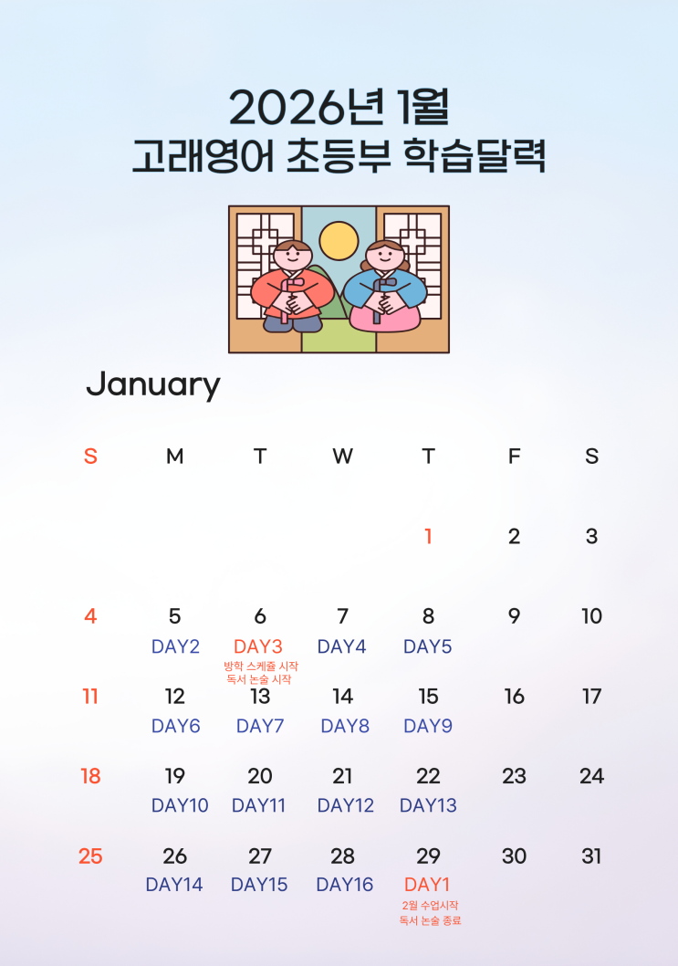 안녕하세요 이제 정말 새해가 이틀전으로 다가왔습니다. 25년 한 해 고래영어를 믿고 사랑스러운 자녀를 보내주신 학부모님들께 진심으로 감사를 드리며 내년에도 원생들이 영어에 대한 흥미를 가지고 한단계~ 한단계~ 더 성장할 수 있도록 노력하겠습니다. 새해 복 많이 받으시고 고래영어 가족들 모두 건강하시고 바라는 일이 이루어져~ 행복한 한해가 되시길 바랍니다~ 아울러 1,2월 스케쥴을 보내드리오니 참고하시어 26년 새해에도 알찬 한해가 되도록 계획을 세워보시기 바랍니다~ <img src="https://blogthumb.pstatic.net/MjAyNTEyMzBfMjM4/MDAxNzY3MDg5NDYwNDgw.flKr6w-i8qEjArvMPuQak6qudmgYp3KjGa2D6_hUuO8g.asVqo26cyXyOZVSEryn_-TxJKv-RWxUltQ0GuG4_-_Qg.PNG/2.png?type=s3" />