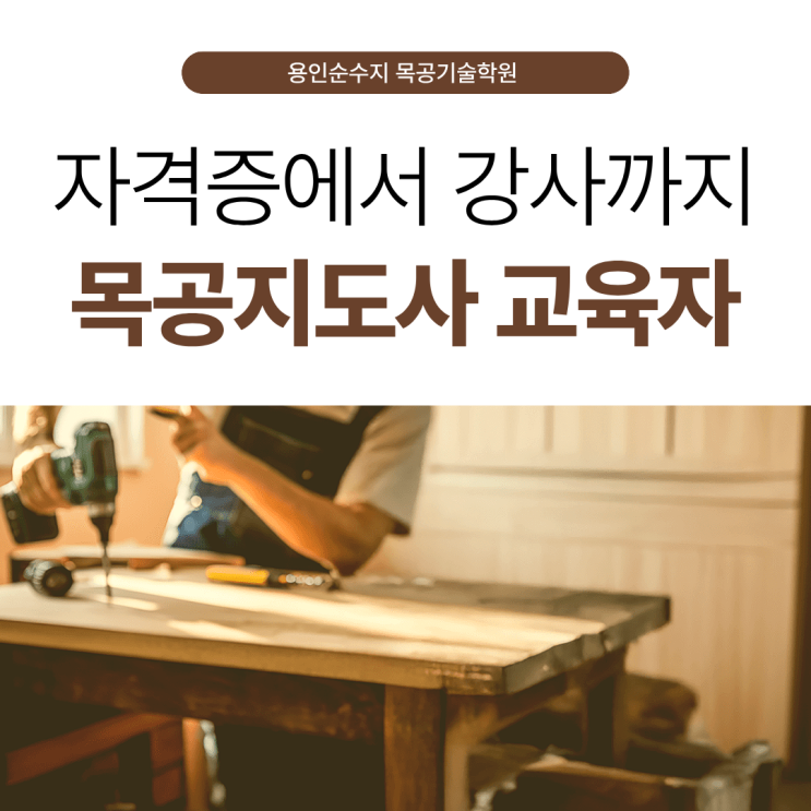 목공지도사 자격증으로 강의까지 수강생 성공 스토리 안녕하세요. 여러분께 목공의 매력을 소개하는 용인순수지 목공기술학원입니다. 오늘은 평범한 수강생에서 목공지도사 자격증을 취득해 어엿한 목공 교육자로 성장한 한 강사님의 이야기를 전해드리려고 합니다. 나무의 결이 안내한 인생의 새로운 길 반복되는 일상 속 정신적 스트레스로부터 자신만의 탈출구를 찾아 목공을 즐기게 된 한 직장인이 있었습니다. 그에게 목공이란 처음에는 나무를 손질하며 작품을 만드는 데서 마음의 위안을 얻는 취미 생활에 불과했습니다. 하지만 그 즐거움이 손의 굳은살로 이어질 때쯤 그는 목공이라는 기술이 주는 삶의 즐거움을 누군가에게 이어주는 목....... <img src="https://blogthumb.pstatic.net/MjAyNTEyMjNfMjk5/MDAxNzY2NDU5Njg5MjA5.VO5b0jJr_2fNmAMIsLX34x3-Ndr0O8Xd196A3G1NvvYg.arWR3d9S8mNyy66A08sLxZuYiYGSj6aqy50YaeLuDI0g.PNG/%B8%F1%B0%F8%C1%F6%B5%B5%BB%E7_%C0%DA%B0%DD%C1%F5%C0%B8%B7%CE_%B0%AD%C0%C7%B1%EE%C1%F6%2C_%BC%F6%B0%AD%BB%FD_%BC%BA%B0%F8_%BD%BA%C5%E4%B8%AE.png?type=s3" />
