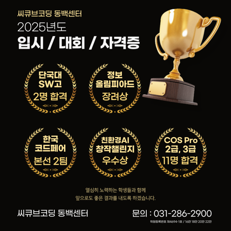 씨큐브코딩 동백센터 원장쌤입니다~ 다사다난 했던 25년도가 마무리 되어 갑니다. 저희 동백센터에서 이루어낸 2025년도의 입시 / 대회 / 자격증 실적을 알려 드립니다. 많은 학생들이 가고 싶어하는 IT특성화 고등학교인 "단국대학교부속소프트웨어고등학교"에 2명이 지원하여 2명 모두 합격하는, 합격률 100%의 놀라운 결과를 이루어 내었습니다. 국내 최대의 SW공모전인 한국코드페어 SW공모전에는 비록 입상은 못했지만 본선에 2팀이 진출하여 대회 준비, 부스 설치, 발표 연습 등 많은 경험을 쌓았습니다. 생성형 AI를 사용하는 대회인 친환경에너지AI창작챌린지에서는 우수상을 수상하는 좋은 결과가 있었습니다. 마지막으로 YBM....... <img src="https://blogthumb.pstatic.net/MjAyNTEyMjZfOTAg/MDAxNzY2NzQzMjU4NzY5.-1quJVIvy89k_kb29gN1cuFd6cUroVCvDhtJR8Ibof8g.fAQui-qb_mMrWf4ecvh6dQ8mkgS1nIy3vSL6JsS4jYkg.PNG/%BF%AC%B5%B5%BA%B0-%BD%C7%C0%FB-001.png?type=s3" />