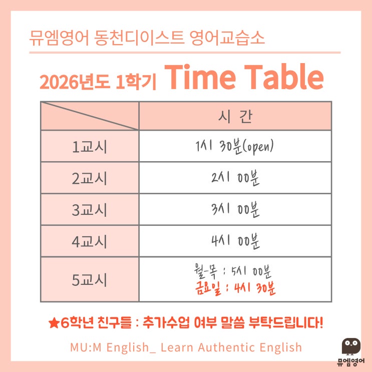 용인 동천초 영어_손곡초 영어_26학년도 시간표 안내 안녕하세요 Sophia Tr 입니다! 2026 학년도 수업 시간표 공유드립니다:) ✅ 스케줄 조정 기간(변경‼️) - 2월 2일 (월) ~ 2월 13일 (금) ✅ 신청 방법 - 구글폼 작성 : 개별 안내 ✅ 안내사항 - 기존 스케줄을 우선합니다! - 하교 후 바로 등원하는 것을 권합니다. - ✨금요일 마지막 타임: 4시 30분✨‼️ ➡️ 금요일 등원 친구가 적어 5시 타임을 임시 폐강하려 합니다 충원이 되면 바로 다시 개설하겠습니다! - 정시 수강이 어려운 경우 가능한 등원 시간을 함께 기재해주세요! 스케줄 확인 후 다시 안내드리겠습니다. ✅올해 여름방학이 굉장히 짧을 것으로 예상되어 2학기는 구글....... <img src="https://blogthumb.pstatic.net/MjAyNjAyMDNfMjUg/MDAxNzcwMTIxNzUwNTU2.RVLlCI3FmwmQmqa-sI_i5b7IXA540zdCdkIdKp_rWacg.KAdzhWXRZ-Py3OhFl4arzy-p1BFl6dpcV7X-6soNqDIg.JPEG/001.jpg?type=s3" />