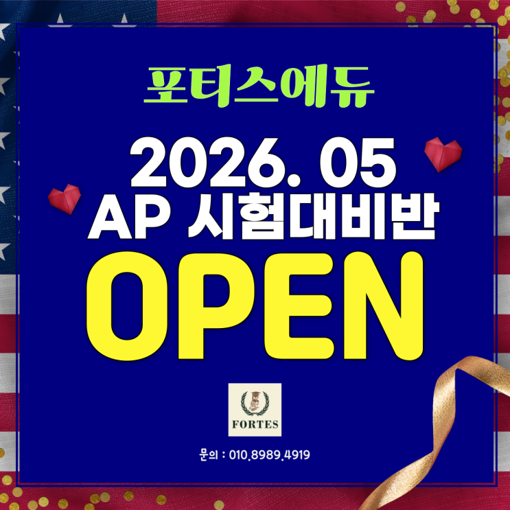 안녕하세요 미국대학 입시전문학원 포티스에듀입니다. 올해도 좋은 결과를 위해 성실히 준비하는 학생들을 위해 2026년 5월 AP 시험대비 문제풀이반을 개설하였습니다. 포티스에듀 AP 문제풀이반은 미국에서 중등~대학까지 졸업 압구정 강사 출신 AP 5점 만점 다수 배출(2025년 포함) 경력을 갖춘 원장님 직강으로 진행되는 실전 문제풀이 중심 수업입니다. AP 시험은 개념만 알고 도전하면 아쉬움이 많이 남는 시험이예요~ 그래서 저희 포티스에듀에서는 실제 AP 시험에 제출되는 문제 유형을 정확히 이해시키고 조금이라도 더 포인트를 얻어 최종 5점 만점 으로 갈 수 있는 방법을 가르칩니다. 1월 개강 문제풀이반 (진행 중) AP Biol....... <img src="https://blogthumb.pstatic.net/MjAyNjAyMDNfMzYg/MDAxNzcwMDg0ODM3MDgz.vsXgcIm3he9gevWm1sPuoukJyCcZcO7eIXSdpXnUKMgg.2mka9soRrlyvUhEtiKXnIsjFdWZYEBahu6MwZUe9GHcg.PNG/%C1%A6%B8%F1%C0%BB-%C0%D4%B7%C2%C7%D8%C1%D6%BC%BC%BF%E4_-044_%281%29.png?type=s3" />