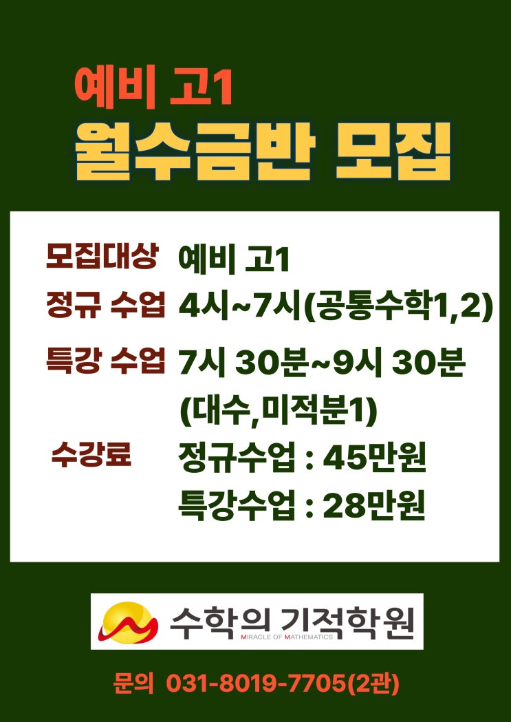 안녕하세요, 1등급을 만드는 수학의 기적 입니다. 본원 (초등,중등관) 상담 및 예약 : 031.272.3727 2관 (초등,중등,고등관) 상담 및 예약 : 031.8019.7705 3관 (초등관) 상담 및 예약 : 031.272.3727 * 학원명 : 수학의기적학원(제3635-5호), 수학의기적2관학원(제4581-1호), 수학의기적3관학원(제 5488호) * 교습과목 : 수학 * 교습비 : https://blog.naver.com/m-math2014/223871970576 [수학의기적학원: 2025년 수업료와 환불규정 안내] 안녕하세요, 1등급을 만드는 수학의 기적 학원 입니다. <본원 수업료> <2관수업료> <3관수... blog.naver.com <img src="https://blogthumb.pstatic.net/MjAyNjAyMDVfMjkx/MDAxNzcwMjUzMzcxMzMx.ynJMmGVdeUTFgtrNYdfbXjmOOnYpxZKcx7MPMPdglKog.RTRh24m1JVurTbKyEsc5PX1krT68RNpc89bXHYA6aoEg.JPEG/%BF%B9%BA%F1%C1%DF3_%BF%F9%BC%F6%B1%DD%B9%DD_%B8%F0%C1%FD_%BE%C8%B3%BB%B9%AE_%284%29.jpg?type=s3" />