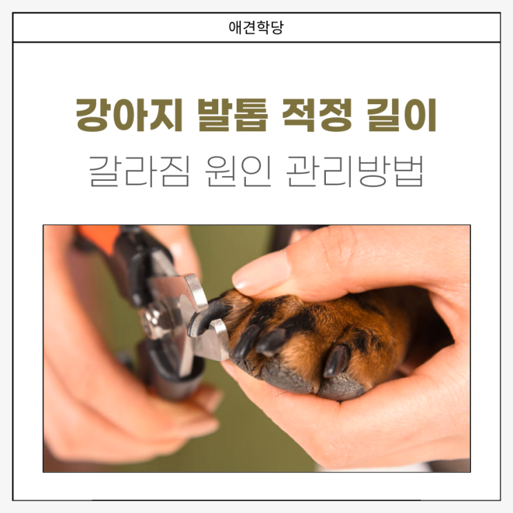 강아지 발톱 관리는 생각보다 중요한 부분 이에요! 산책을 자주 시키면 자연스럽게 마모되긴 하지만 그렇지 않은 경우도 많아요. 강아지 발톱이 너무 길면 관절에 압박이 생길 수 있고 보행이 비정상적이게 될 수 있죠. 게다가 발톱 갈라짐, 깨짐은 통증과 감염위험 까지 동반될 수 있기 때문에 주의해야합니다. 오늘 강아지 발톱 적정 길이와 갈라짐 원인 그리고 집에서 관리하는 방법 까지 차근차근 정리해보려고 합니다! 강아지 발톱 적정 길이 강아지 발톱을 집에서 자를 때 어느정도 길이가 적당한지 고민이 되는 분들이 많아요. 사실 가장 쉬운 기준은 바닥을 걸을 때 딱 딱 소리가 나는지 아닌지만 기억해주시면 되요. 걸을 때 딱딱 부딪....... <img src="https://blogthumb.pstatic.net/MjAyNTEyMTFfMjMx/MDAxNzY1NDYxNTg2NTI3.rZQgV3nI8Vi2kT9ZBAQhvlSt9T_DAHy9imKd973UUCkg.VjNQZ-nkxgUhl2_3QEXjCBNQAXKOW2d2xU8i621NRXAg.PNG/%C1%A6%B8%F1%C0%BB-%C0%D4%B7%C2%C7%D8%C1%D6%BC%BC%BF%E4_-001.png?type=s3" />