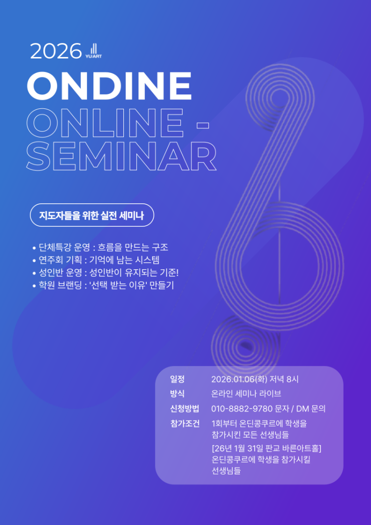 음악학원운영세미나 학원운영의 전반적인 모든것!! 바로 내학원에 적용 가능한 실질적인 팁들!! 경험해보고 성공해본 보증된 농축 운영비법들만 모은 실전 세미나!! 레슨은 좋은데 운영은 머리아프시죠 지도자들을 위한 실전 세미나 - 단체특강 운영 흐름을 만드는 구조 - 연주회 기획 기억에 남는 시스템 - 성인반 운영 유지되는 기준 - 학원 브랜딩 선택받는 이유 만들기 1번째 음악학원운영비법 온딘세미나 알짜배기만 모아 아낌없이 풀어드리는 실전적용 학원운영비법들 놓치지 마세요!! 일시 26년 1월 6일 화요일 저녁 8시 온라인세미나 참가조건: 1회 콩쿨부터 온딘콩쿠르에 학생을 참가시킨 모든 선생님들, 25년 1월31일 판교 바른아트홀....... <img src="https://blogthumb.pstatic.net/MjAyNTEyMjJfMTI2/MDAxNzY2Mzg4ODYyOTUx.9AZ3rXyWVhucUZW57EW30N1k17FMAw6FvWRiLEvOOtIg.cfXEPnUzFnrboYz8U3KYktVwQaYecNS0X9IFIRPrlRUg.PNG/%BF%C2%B5%F2%BC%BC%B9%CC%B3%AA1.png?type=s3" />