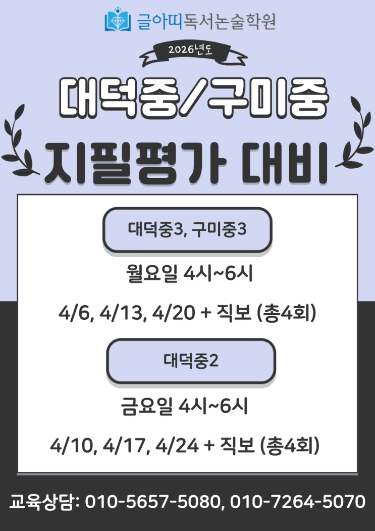 안녕하세요! 글아띠독서논술학원입니다. 슬슬 벚꽃들이 피고 있네요. 그렇다는 것은 우리의 시험도 다가오고 있다는 말이지요..... 하지만 걱정은 하지 말아요~ 글아띠 젼쌤이 있으니까요! 대덕중3과 구미중3은 중간고사 지필평가 국어 내신 수업을 함께 합니다. 월요일 4시~6시에 진행하고요, 4/6 개강입니다! 대덕중2 중간고사 지필평가 국어 내신 수업은요, 금요일 4시~6시에 진행합니다. 4/10 개강입니다. 모두 자습서와 체크체크 문제집 잊지 말고 챙겨오고요~! 내신 수업만 한달 반짝 수강할 친구들도 모두모두 환영입니다. 3년 내내 정규 수업 논술은 안 듣고 시험 준비할 때만 수강하는 친구들이 꽤 있어요. 필요한 것만 쏙쏙! 주체적인....... <img src="https://blogthumb.pstatic.net/MjAyNjA0MDFfMjM5/MDAxNzc1MDE1OTQ3ODU1.t4OTR3RCpG1ALfUSlSqXVeM-ue_LUDt-5aSkID-IOCEg.StQeOsz5o5JjIB1_Ywn4lkrKaOxMmVQGEaJekGFWiSQg.PNG/%C1%A6%B8%F1%C0%BB_%C0%D4%B7%C2%C7%D8%C1%D6%BC%BC%BF%E4._%281%29.png?type=s3" />