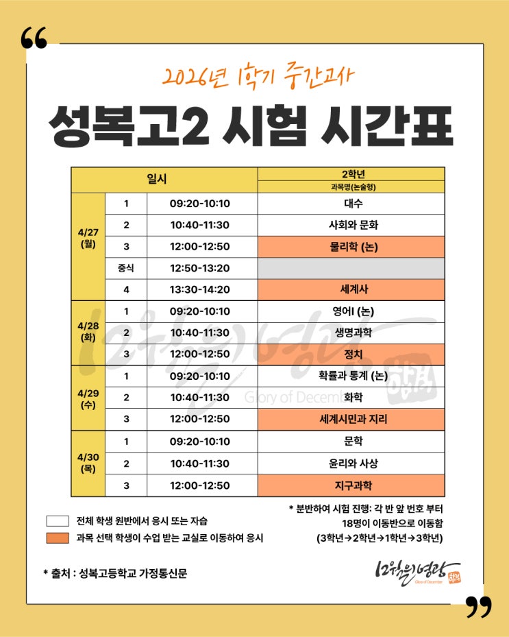 2026년 1학기 중간고사 성복고2 시험 시간표
