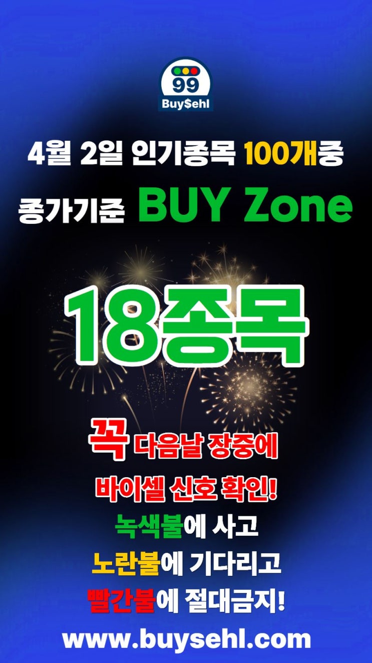 바이셀, 4월2일 인기검색종목 100개 중 BUY Zone 종목은? 에코플라스틱? 휴스틸? 와이지-원? 대명에너지? 넥스틸? 한텍? 세운메디칼? 바이셀 신호를 확인하세요~