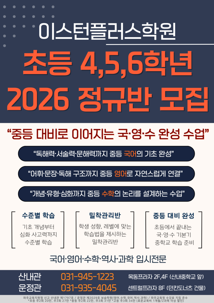 Feel it ! speak it ! 여권 없이, 유학가자! 오감랭귀지 안녕하세요! 새 학기를 앞두고 수업 등록 문의를 많이 주시는데요, 오감랭귀지 파주운영점의 교육 방식에 대해 소개드리고자 해요! 오감랭귀지는 영어로 생각하고 말하는 진정한 언어 능력을 기르는 교육을 추구하고 끊임없이 연구하는 브랜드입니다. 파닉스부터 차근차근 시작해 말하기와 사고로 확장되는 단계별 커리큘럼, 그리고 아이의 속도를 앞지르지 않는 환경 설계. 오감랭귀지는 5세부터 13세까지 그 기준을 놓치지 않고 계속 연구해 나갑니다. 전통과 신뢰의 영어 교육, 오감랭귀지 오감랭귀지 파주운정점의 교육 철학 3가지 영어를 몸으로 익히고 말하는 '소통의 언어....... <img src="https://blogthumb.pstatic.net/MjAyNjAyMDRfMjM3/MDAxNzcwMTkyMjAyNjAz.cJaojPo0BduZ83BjBcYF_ZGKxAjaVJQRwuNJVYE4BO4g.edCMpVMbRtDE-iAqw177IydDs6d9EcO0_q0yLU6OPj8g.PNG/%BD%BA%C5%A9%B8%B0%BC%A6_2026-02-04_%BF%C0%C8%C4_1.45.32.png?type=s3" />