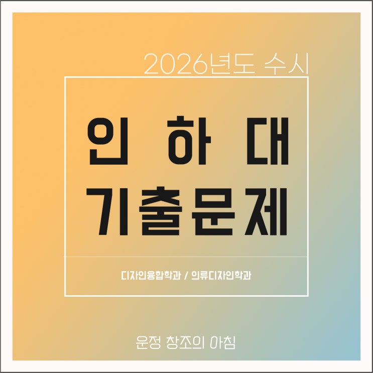 안녕하세요! 운정 창조의 아침입니다. 오늘은 2025년 10월 11일, 12일에 있었던 인하대 수시 실기시험 주제 편입니다! 디자인융합과와 의류 디자인과의 소재와 경쟁률까지 한 번에 정리해 보도록 하겠습니다. 2026학년도 인하대 미대 수시 디자인 융합과 주제 ●문제 정리● 톱니바퀴 뜨개질바늘 휴대용 선풍기 실타래 탁구공 주어진 이미지를 이용하여 "순환"을 구성하고 표현하시오. ●경쟁률 정리● 모집인원 23명 → 35.91 : 1 (2025학년도 39.04 : 1) 2026학년도 인하대 미대 수시 의류 디자인 학과 주제 ●문제 정리● 노리개 바람개비 카세트테이프 주어진 사물의 조형적 특성과 기능을 활용하여 자유롭게 연출하고 표현하시오....... <img src="https://blogthumb.pstatic.net/MjAyNjAxMDhfMjcx/MDAxNzY3ODYxNjMxNDg3.2cQM2nCcdNZXZH5CAvKY92C6DaoLrXvG5G0_UXMrD-wg.eSJ1FjgCCjp9TSaMeeEqGbquTpe76Kij6KXOjSJ7yu0g.JPEG/%BC%F6%BD%C3%C1%D6%C1%A6%C7%A5.jpg?type=s3" />