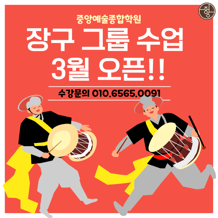 안녕하세요 중앙예술종합학원입니다 3월 개강예정인 장구수업 수강생을 모집하고 있습니다! 나만의 소리를 만들고 리듬을 찾아가는 과정에서 지금껏 느껴보지 못했던 즐거움과 힐링의 시간이 될 것이라 확신합니다! 장구를 연주할때의 자세, 타법, 호흡법 등을 배우며, 우리가 흔히 잘 알고있는 기본장단 (굿거리, 자진모리, 세마치, 휘모리 등) 을 신나게 배우는 과정속에서 가족적인 분위기와 함께 어울려 즐거움과 보람이 배가 될거예요 장구! 어렵지 않습니다~ 배우기에 대한 의지와 열정만 있다면 누구나 가능합니다! 일상에서 받은 스트레스를 해소하고 즐겁게 즐기다 가세요! 한국전통장단의 호흡을 배우고 풍물의 흥겨움에 흠뻑....... <img src="https://blogthumb.pstatic.net/MjAyNjAyMDZfMjYg/MDAxNzcwMzYwOTI4MzM2.iDMqm1OkaifZl8g3gLkuiNOA14TK1ZGqyWp98zX0n1kg.j8fWYdFDV9WuNwXV5OFJtZoRu2TAUz0vT2KiqFluwa4g.PNG/001.png?type=s3" />