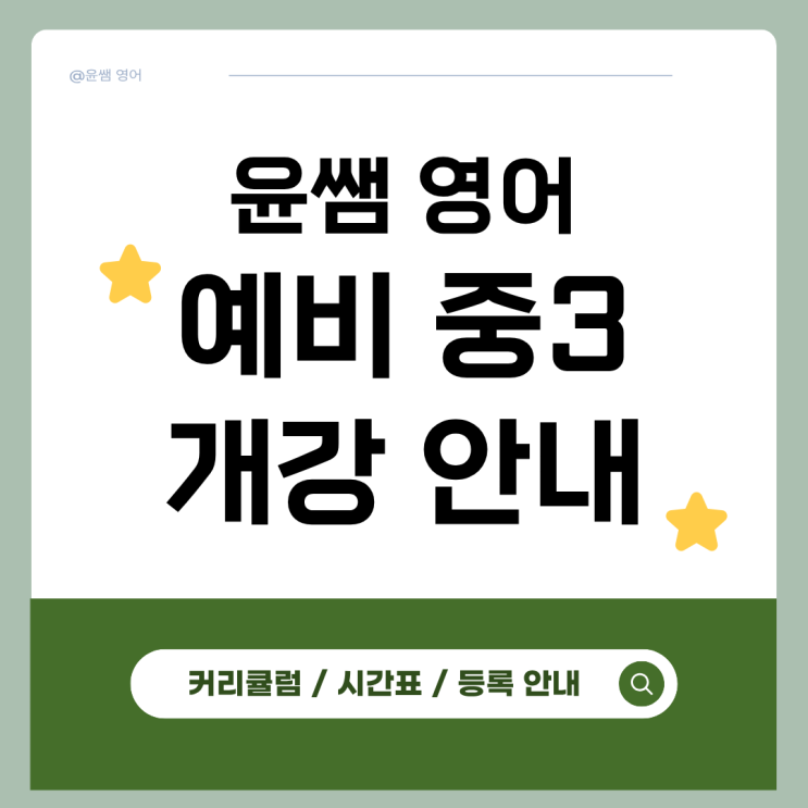안녕하세요. 윤쌤 영어 학원입니다^^ 성공적인 대입을 위한 첫걸음! 수능영어의 토대를 다진다! 중학교 3학년을 위한 개강 안내를 드립니다. 윤쌤 영어는 중등 과정을 완벽하게 마무리하고 고등 영어에 성공적으로 진입할 수 있도록 확실한 연결고리를 만들어 드립니다. 학원 커리큘럼 : 고등 3년, 흔들림 없는 로드맵 윤쌤 영어 학원에서는 중학교 졸업 후 맞이할 고등학교 3년 영어 학습의 로드맵을 체계적으로 제시합니다. - 고1 내신과 모의고사의 균형 잡힌 연습으로 실력 쌓기 - 고2 평가원 유형에 익숙해지는 실전 훈련으로 시험 적응 -고3 실전 모의고사로 완벽하게 실력 점검 학년별 수업으로 차근차근 실력을 키워드립니다. 예비 중3 수....... <img src="https://blogthumb.pstatic.net/MjAyNTExMjVfMjM0/MDAxNzY0MDU4MzEzMzM0.kkGhCCMbV_e-jvouRC4VCbc8_CtfAJTN6Z8O8dequ8gg.jGi4MXPinUVFaP2hTawTgKzWroQakzGtTR0I3UMMx54g.PNG/1.png?type=s3" />