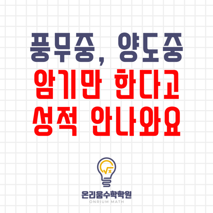 제가 10여년전 본격적으로 수학을 가르치던 때에는 교과서 문제 암기만 해도 성적이 나오던 시절이 있었습니다. 불과 4년전만 하더라도 양도중 시험은 기말고사뿐이었고 그 시험마저도 엄청나게 쉬운 문제들 뿐이었습니다. 이젠 시대는 바뀌었습니다. 암기식 수학 학습이란? 말그대로 문제들을 달달 외워 시험을 준비하는 방법입니다. 예전 10여년전까지 유행했던 대부분 학원의 학습법입니다. 그 당시는 교과서 문제들을 위주로 학교시험이 출제되었기 때문에 교과서 문제 혹은 교과서 변형만 같은 학습지로 5회정도 풀리면 시험성적이 잘 나왔습니다. 하지만 그동안 시대는 많이 변했고 학생들의 생활습관과 학교시험의 많은 변화가 있었습니다....... <img src="https://blogthumb.pstatic.net/MjAyNTEyMDNfMzAg/MDAxNzY0NjkyNTI1MjEw.JsKo0MWznm2R5_klPmxkV7ZSMoUjj005tyxokzn1Jf4g.WGWycN_GcH3AoXXJiQ1854R7Sj-8iMLzJcplBghmR48g.PNG/%C1%DF%C7%D0%BB%FD-%BC%F6%C7%D0-002.png?type=s3" />