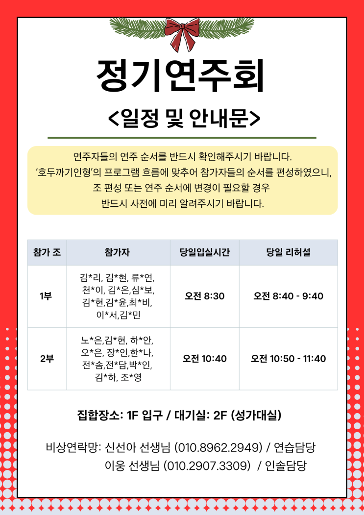 안녕하세요! 다가오는 정기연주회에 참여하는 학생들과 학부모님들께 안내드립니다. 이번 연주회는 ‘호두까기인형’의 흐름에 따라 프로그램이 구성되었으며, 모든 참가 학생들의 연주 순서도 이에 맞추어 편성되었습니다. 연주 흐름을 자연스럽게 이어가기 위해 ✔ 참여 조 편성 또는 ✔ 개별 연주 순서 변경이 필요하신 경우, 반드시 사전에 미리 연락 부탁드립니다. 리허설 안내 아래와 같이 연주회 전 리허설이 진행됩니다. 12월 5일 (금) / 프로비 음악학원 ⏰ 오후 6:00 – 7:30 ✔ 자기 순서 연습 후 귀가 12월 12일 (금) / 프로비 음악학원 ⏰ 오후 6:00 – 7:30 ✔ 자기 순서 연습 후 귀가 12월 13일 (토) / 고촌아트홀 1부....... <img src="https://blogthumb.pstatic.net/MjAyNTEyMDRfMTUw/MDAxNzY0ODI2NjA5MTQ0.b0pTCeiRjzyynXYk3GmPTEOQPlDKJv9ZXm6eb3fb8kMg.XoZHQL50oWRPoyDuvUqz-cnm5Y5ugv_cW5NqeDmQYuwg.PNG/2.png?type=s3" />