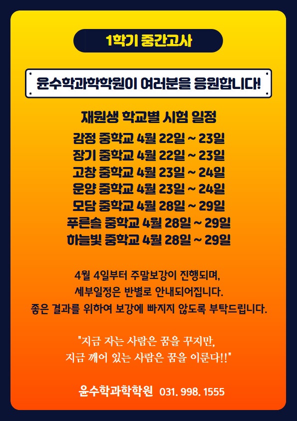운양동수학학원 윤수학과학학원 중간고사대비 일정안내