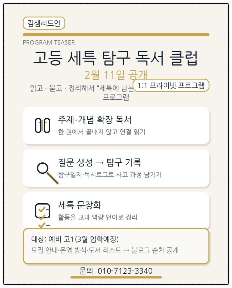 #교과세특#봉담고#화담고#수행글쓰기#글쓰기#수행평가#국어내신#김샘리드인#독서로시작하는수능#봉담독서논술#봉담중등국어#봉담중#수현중#봉담고#화담고#봉담초#수현초#내리숲초#국어문해력#수능교과세특#인문독서#과학탐구독서#사회탐구독서 오랫동안 고민하고, 준비해 왔습니다. 아이들의 입시에서 가장 의미 있는 학생부는 결과가 아니라 과정이 남아 있는 학생부라고 믿습니다. 학생부전형의 비중이 커진 지금, 저희는 내신 수업을 하지는 않지만 함께 읽고, 묻고, 탐구하는 과정을 만들고자 합니다. 고등 과정에서도 독서는 반드시 필요합니다. 다만 “시간이 없어서” 멀어지기 쉽지요. 그래서 시간이 없어도 가능한 루틴을 먼저 설계했습....... <img src="https://blogthumb.pstatic.net/MjAyNjAyMDRfMTQ1/MDAxNzcwMTc5NTE0MjI1.l4qSZsdEJN8M8jMf2XCqPC0aSqkXelRCNXCKuhvhmVAg.AfzsF_zw1kHh2IVHvNpQHIvRq359dMCPZX5KbdbDZ4gg.JPEG/%C3%D6%C1%BE%BA%BB.jpg?type=s3" />