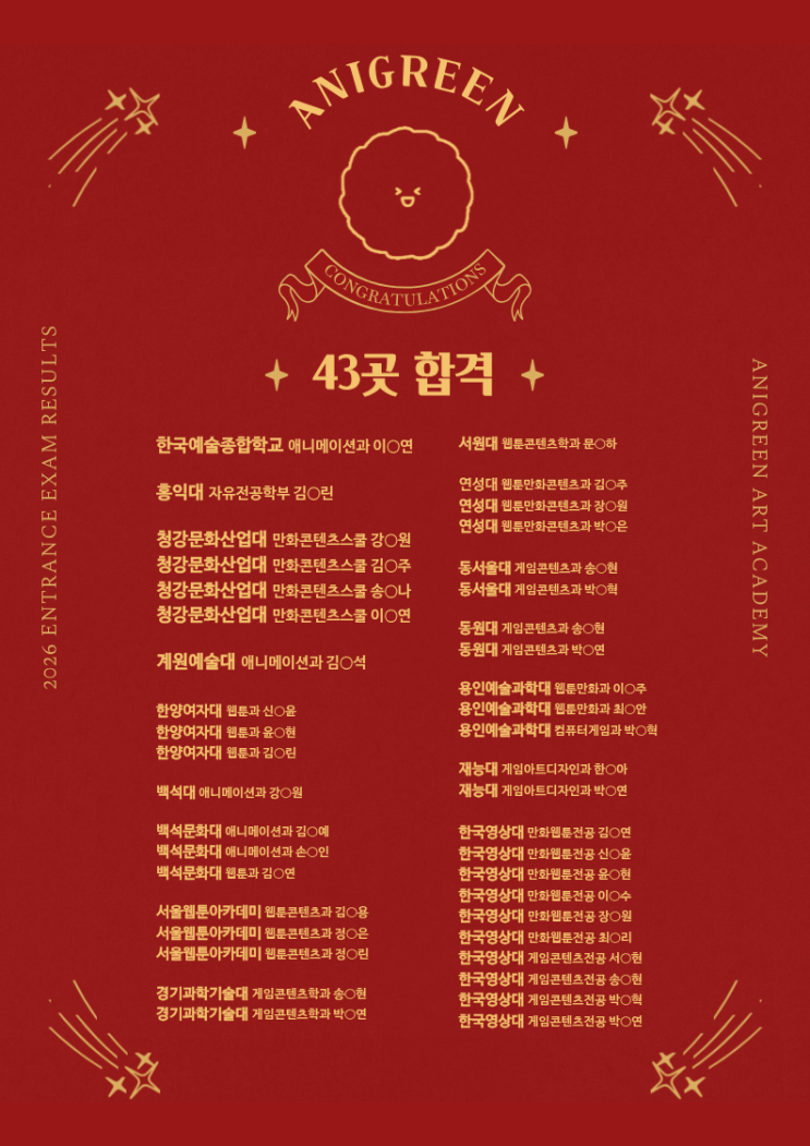 안녕하세요!☺️ 2026학년도 수시 전형이 마무리되면서 애니그린 미술학원에서도 기쁜 소식을 전할 수 있게 되었어요!ㅎㅎ 이번 수시 전형에서 무려 26명이 학생이 43곳에 합격하는 대단한 결과가 나왔답니다! 2026 수시 합격 현황 한국예술종합학교(한예종) : 1명 홍익대학교 : 1명 청강문화산업대학교 : 4명 계원예술대학교 : 1명 연성대학교 : 3명 SWA(서울웹툰아카데미) : 3명 백석대학교 : 1명 백석문화대학교 : 3명 한양여자대학교 : 3명 경기과학기술대 : 2명 서원대 : 1명 동서울대 : 2명 동원대 : 2명 용인예술과학대 : 3명 재능대 : 2명 한국영상대 : 10명 끝까지 수업을 따라와 준 학생들에게 무엇보다 먼저 긴 시간 동....... <img src="https://blogthumb.pstatic.net/MjAyNTEyMjZfMjcy/MDAxNzY2NzQ2NDc3MjQ0.lbMEoM05cOu-8CYErkzDGYFN9DjHAnzO_vZ-Y3fNzjAg._rIbO46ghtuplhseVUc5J2QSonup0lJQFh0xokcLwHsg.PNG/28.png?type=s3" />