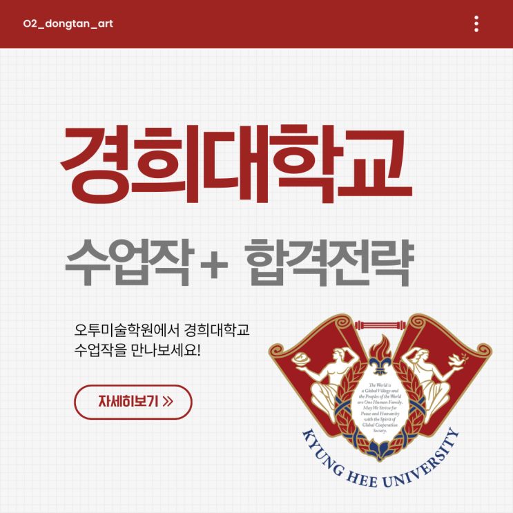 경희대학교는 미대입시를 준비하는 학생들에게 꾸준히 높은 선호도를 보이는 학교입니다. 동탄 지역에서는 거리가 가까운 편이라 경희대 미대 진학을 목표로 준비하는 학생들이 많은 편인데요! 이번 글에서는 동탄미대입시를 준비하는 과정에서 참고할 수 있도록, 경희대학교 모집요강과 오투미술학원 수업작들을 함께 정리해보겠습니다!! 경희대 미대 주요 변경사항 기존 경희대는 3절 화지를 반으로 나눠 4시간 동안 왼쪽에는 소묘, 오른쪽에는 디자인을 함께 시험을 치르는 방식을 실시했는데 올해부터 4시간이었던 시험은 3시간이 되고 3절이었던 화지는 4절로 바뀌면서 디자인 종목만 실시하게 되었습니다. 경희대학교는 작년과는 다르게 수....... <img src="https://blogthumb.pstatic.net/MjAyNTEyMTZfMzkg/MDAxNzY1ODcwMzI5NjIz.G5ekgwjAFrSR-HyZerCnS7tdK6C0ne7RK783QCmXxUsg.Dgqzd00rp0iBtxgw1PqyWjqj2ObFiYBz9lF6x7dW0QEg.PNG/%B5%BF%C5%BA%B9%CC%BC%FA%C7%D0%BF%F8_%B0%E6%C8%F1%B4%EB_%B9%CC%B4%EB_%C7%D5%B0%DD%C0%FC%B7%AB.png?type=s3" />