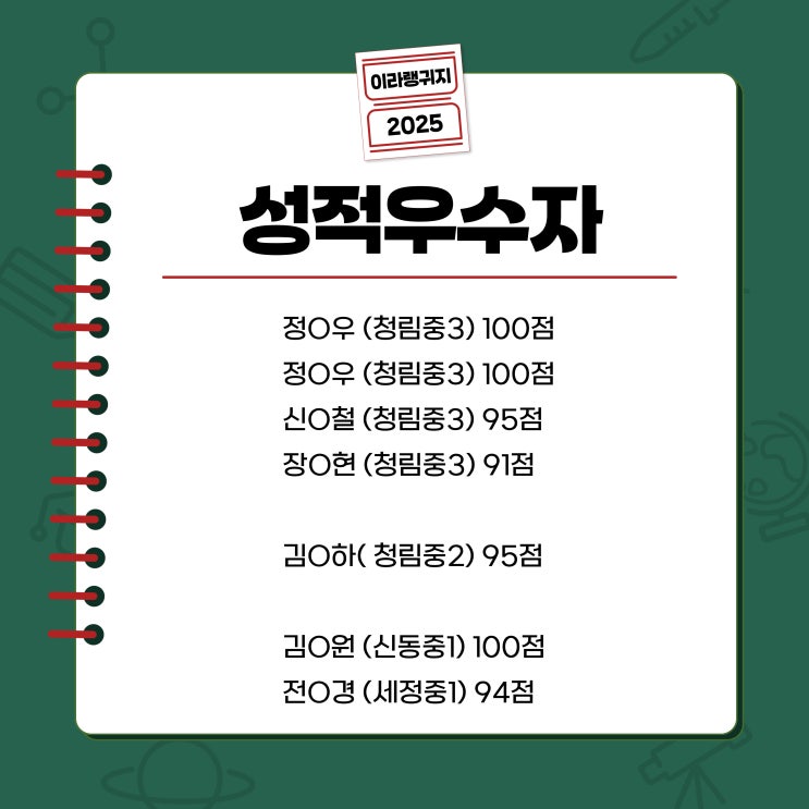 #산척동영어 는 역시 이라랭귀지 안녕하세요! 2학기 기나 긴 시험기간을 끝내고 돌아온 이라랭귀지입니다:) 마지막 글이 여름휴가였는데 너무 오랜만에 돌아왔죠? 오랜만이지만 뿌듯한 마음으로 돌아온 산척동 영어학원 이라랭귀지입니다! 10월, 11월 중3 시험 11월, 12월 중1, 중2 시험 대비로 정말 정신없는 하반기를 보냈습니다. 이라랭귀지는 소수정예학원이라, 사실 성적 공개에는 불리할 수 밖에 없습니다. 학생들이 적으니 보여지는 것은 적을 수 밖에 없지요. 오히려 공개하는게 오해를 살까봐 그동안 언급을 많이 하지는 못했었습니다. 하지만 이번엔 다릅니다. 87.5%가 90점 이상을 받았습니다! 특히 1학년 학생들은 첫 시험이라 긴장....... <img src="https://blogthumb.pstatic.net/MjAyNTEyMjFfMjQz/MDAxNzY2MzAyNjk0OTQ3.pJhx1zhtzhHIDq1SsFLvTAQhm2PZCTzRIN0nJ8_IxUog._GVaD7SRQrNCJWKN9vPbbqypmXkzzP4ePw159oCXB30g.JPEG/%C1%A6%B8%F1%C0%BB-%C0%D4%B7%C2%C7%D8%C1%D6%BC%BC%BF%E4_-002.jpg?type=s3" />