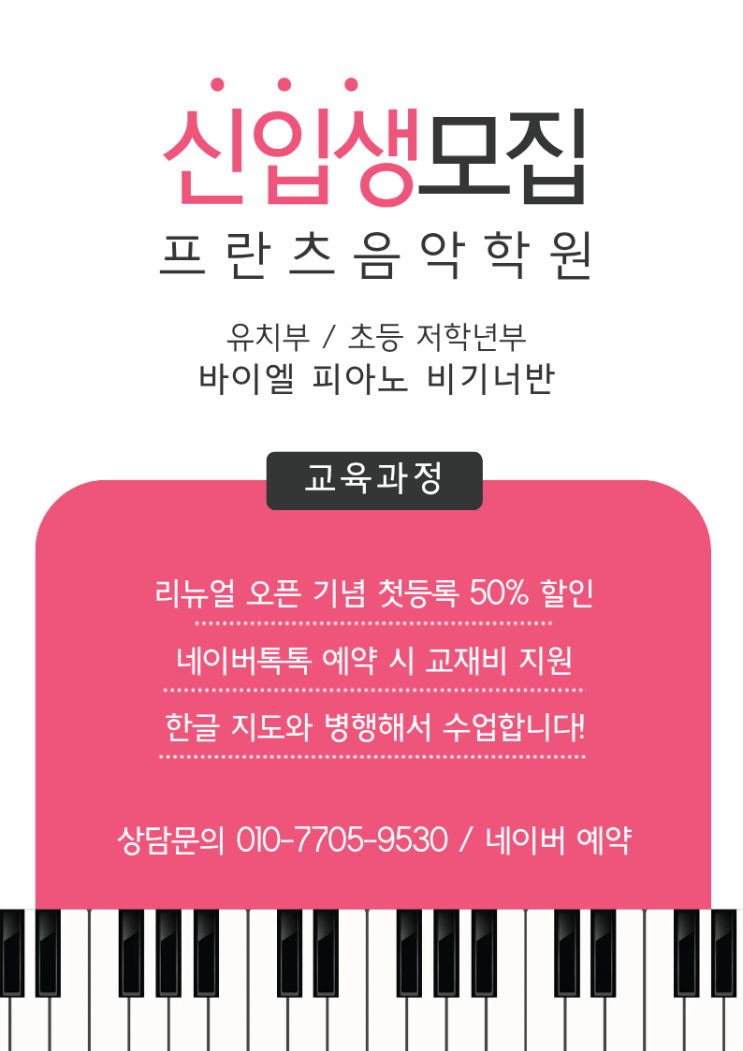 안녕하세요 프란츠음악학원입니다 ㅎㅎ 이번에 학원을 리뉴얼하면서, 유치부/초등부 비기너 피아노반을 새로 신설했습니다! 아이들이 " 피아노 " 와 함께 " 한글 " 을 쉽고 재미있게 배울 수 있도록 커리큘럼을 구성했습니다 [ 피아노 + 한글반 과정 ] 계이름으로 배우는 한글수업 피아노 연주 기초 다지기 어린이 동요곡 배우기 프란츠음악학원은 늘 진심과 열정으로 아이들을 지도하고 있습니다 많은 관심과 성원 부탁드립니다 상담문의 010-7705-9530 / 네이버 예약 <img src="https://blogthumb.pstatic.net/MjAyNTEyMjRfNjYg/MDAxNzY2NTU0Nzg3NTU2.8rjw-Q-pMAzjoQDogPfqT8htMa16Wr6mVH2o9RrXQBEg.GLAZXq-G-4o93BQVOsNI-J3SWr-HmV9b4VsIbA6QQzUg.PNG/%C1%A6%B8%F1%C0%BB_%C0%D4%B7%C2%C7%D8%C1%D6%BC%BC%BF%E4._%283%29.png?type=s3" />