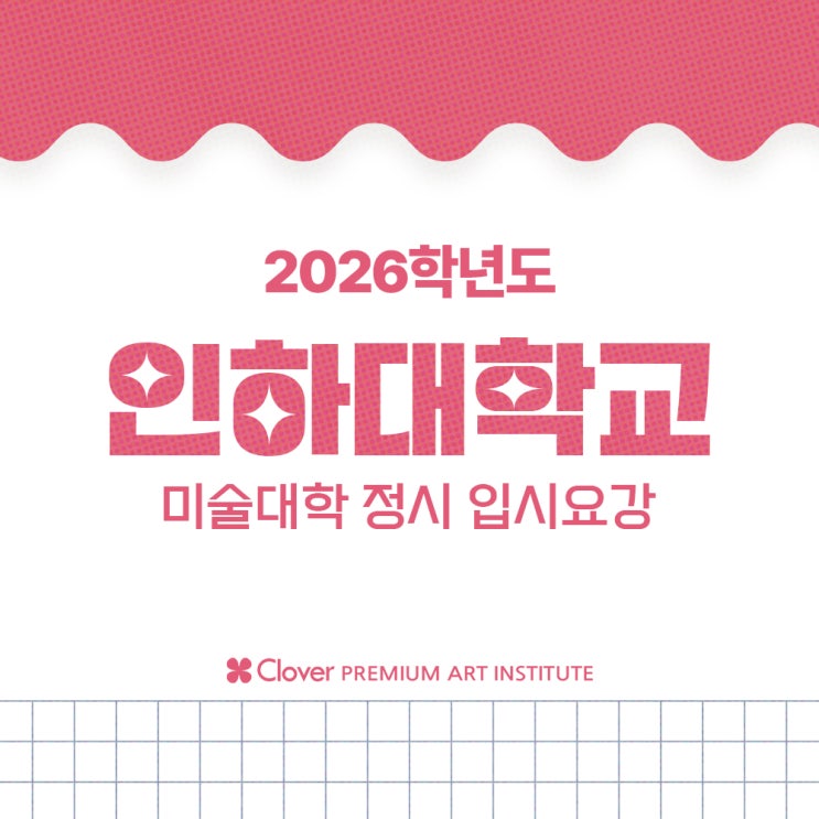 안녕하세요. 2026학년도 미대입시요강을 안내드리는 클로버미술학원입니다. 이번에는 인하대학교의 미술대학 정시모집 요강을 안내드리고자 찾아왔습니다^^ 인하대를 목표로 준비하고 있는 수험생분들을 위해 전형 일정, 실기고사 방식, 모집 인원, 전년도 경쟁률 및 주요 사항 등 입시 준비에 실질적으로 도움이 될 수 있는 핵심 정보들을 정리해드렸습니다. 아래 내용들을 차분히 살펴보시면서 본인에게 맞는 전략을 점검하고, 남은 시간 실기 준비에 집중하시는 데 조금이나마 도움이 되길 바랍니다. 앞으로도 주요 대학별 미대입시요강과 분석을 지속적으로 안내드릴 예정이니 많은 관심 부탁드립니다 :) 먼저, 26학년도 인하대학교의 미대 정....... <img src="https://blogthumb.pstatic.net/MjAyNTEyMjZfMzQg/MDAxNzY2NzI4NTQ3ODk2.CGUyt1XVHbwXgkYGSgosE6wRIDnkLRXbmXSUvfiW2F0g.d9ox6wxqdshGW6n0pC0DoZ1zF84-i-uh3B-KXF9Q1fkg.JPEG/1.jpg?type=s3" />