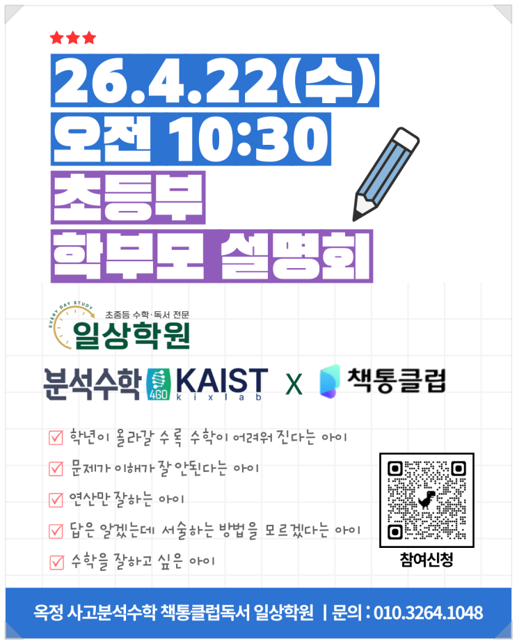 with 공선생 저학년 때와는 결이 다른 고학년 수학의 벽! 문제를 무작정 풀기보다 문제를 분석하는 눈과 지문을 읽어내는 힘을 길러줘야 할 때입니다. 그래서 준비했습니다. 참석 학부모님 특별 혜택 설명회에 참석하신 분들에 한해, 우리 아이의 현재 위치를 정확히 파악할 수 있는 [개별 진단테스트 및 1:1 맞춤 상담] 일정을 우선적으로 잡아드립니다. (아이의 학습 상태를 정밀 점검해 드리는 소중한 기회입니다!) 일시: 2026년 4월 22일(수) 오전 10:30 장소: 일상학원 문의: 010-3264-1048 신청: https://forms.gle/3tHSrqAcLPiygb2B6 아이의 공부 그릇을 키우는 골든타임, 일상학원이 함께 고민하겠습니다. #옥....... <img src="https://blogthumb.pstatic.net/MjAyNjA0MDZfMjcw/MDAxNzc1NDQxNjQ0NzQ4.8JANLzcGBMANNwAMuHS1g7a96VMwi032Tt3aBRRpHIQg.ICFNDj43mY1EJ_6Qa7opFtZy0FbCTGZoCiNl4c5KMxwg.PNG/%C7%D0%BA%CE%B8%F0_%BC%B3%B8%ED%C8%B8.png?type=s3" />