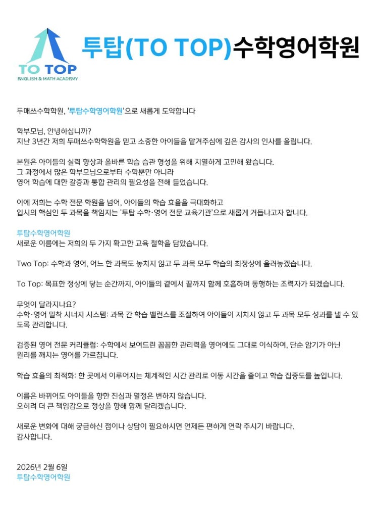 새로운 변화, 투탑수학영어학원