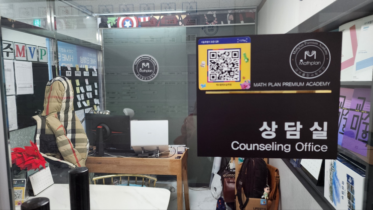 안녕하세요? 자양동 수학학원 매쓰플랜 원장입니다. 우리 아이들이 공부하는 학원은 어떤 모습일지? 매쓰플랜은 어떤 모습일지 궁금하시죠? 오늘은 저희 학원 매쓰플랜을 한번 소개해 드리겠습니다. 1. 상담실 상담을 오면 여기에서 상담을 하게 됩니다. 자양동 수학학원 매쓰플랜에서 사용하는 교마수학 교재들과 기다리시는 동안 읽으실수 있는 리플렛 간단한 차 종류들이 준비되어 있습니다. 상담실에 앉으면 초등부터 고등까지 수학계통도인 수학개념도가 붙어있습니다. 요람에서 무덤까지 초등때 만나서 명문대 합격 이 바로 매쓰플랜의 슬로건입니다. 상담실에서 한장 찍어보았습니다. 2. 학원 정면 출입구 본관은 진로마트 4층에 있습니다....... <img src="https://blogthumb.pstatic.net/MjAyNjAxMTNfMjcx/MDAxNzY4Mjg3MzA0MTEz.PjcnQeBKnPsSrRY5m87mDzqNrMvXnvz8AWCpY1V1RtYg.Z-SBui4joDw46BWyvy2VYUZwg3-XZg-HiujaA4r-f5sg.PNG/image.png?type=s3" />