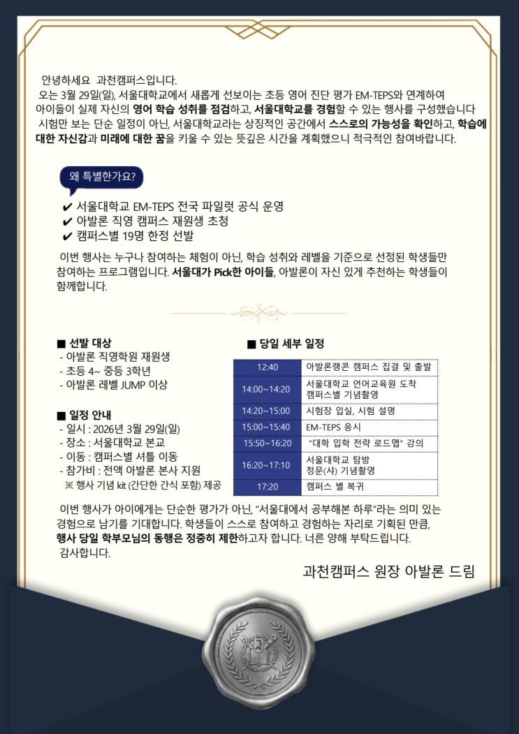 그대여 그대여 그대여 그대여 그대여 오늘은 우리 같이 걸어요 서울대에~♬ 봄바람 휘날리며어어~ …우리는 서울대로 향합니다 3월 29일,벚꽃 피기 딱 좋은 그 계절에 서울대학교에서 영어 실력 점검 완료 학생 과천 살제?? 우리가 뭐 다 했으! EM-TEPS 보고, 캠퍼스 보고, 대학 입학 전략 강의까지 듣고! 이건 그냥 시험이 아니라 “서울대에서 공부해본 하루”라는 살짝 설레는 추억 만들기 서울대가 Pick한 아이들, 자신감도 만개 가능성도 만개 우리 친구들 미래도 만개 올봄엔 벚꽃만 피는 게 아닙니다. 아이의 레벨도 같이 피어납니다 <img src="https://blogthumb.pstatic.net/MjAyNjAzMDNfMjAy/MDAxNzcyNTM5NTU4MDQ1.DgNLiD51ProUNs9dH4bQuhs2O2LmJyfGPm7XV5LACyAg.MnZtkS_N9jpYYj8VL5quysrOn1p_pc8oT04h4dZS2PMg.JPEG/%BC%AD%BF%EF%B4%EB_%BF%B5%BE%EE_%BC%BA%C3%EB_%C4%B7%C7%C1_%C7%D0%BA%CE%B8%F0_%BE%C8%B3%BB%B9%AE_%BC%F6%C1%A4%BA%BB_1.jpg?type=s3" />
