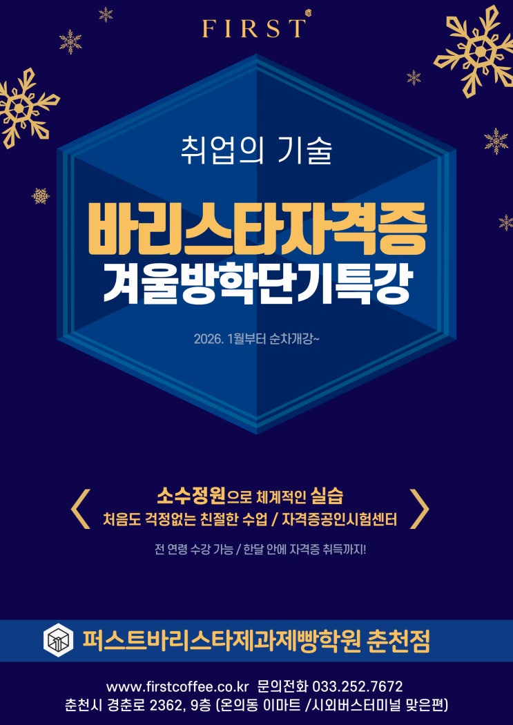 안녕하세요 오늘은 퍼스트바리스타제과제빵학원 춘천점에서 겨울방학특강 바리스타 자격증 단기특강 개강을 안내드리겠습니다^^ ✔ 대상: 전 연령 수강 가능 ✔ 기간: 1월부터 순차 개강 ✔ 방식: 소수정원으로 체계적인 실습 중심 + 자격증 대비 커리큘럼 위치: 춘천시 경춘로 2362, 9층 퍼스트바리스타제과제빵학원 (온의동) 문의: 033-252-7672 카카오톡 상담: http://pf.kakao.com/_vDbHK 수강 혜택 ① 실습 재료 제공 (우유, 원두 등) ② 친구랑 등록시 5만원 상당 교보재 증정! 선착순 마감! 사전예약 필수 실습부터 자격증까지, 겨울방학에 한 번에! ☕ 꿈꾸던 바리스타, 지금 시작해보세요^^ <img src="https://blogthumb.pstatic.net/MjAyNTEyMTlfNDYg/MDAxNzY2MTI2NTg2NjE4._zOqvOMT0gKKHQtpTF7CTyWRT-0OsgePcFXb1U4mOxYg.KoAeXqZzoTnNqy9QaquZbosYJbjfuWt8KlTvqXimOrcg.JPEG/%B0%DC%BF%EF%B9%E6%C7%D0%C6%AF%B0%AD_2025.12.19.jpg?type=s3" />