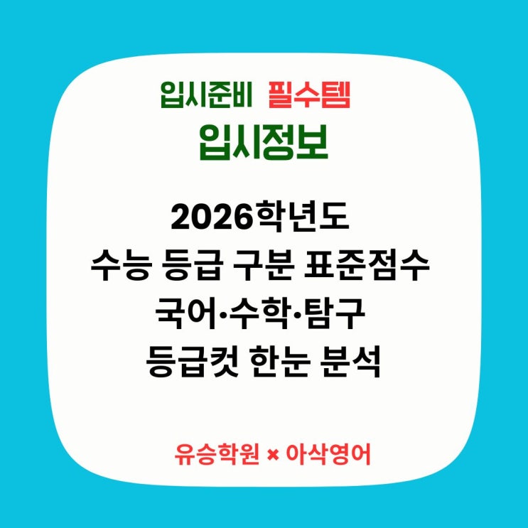 원주시 단구동에서 20년 넘게 국영수 학습을 지도하며 많은 학생들의 성장을 함께해 온 유승학원입니다. 유승학원은 수학·영어 전문 학원으로, 수학은 단계별 맞춤 수업, 영어는 아삭영어 원장님 직강 시스템을 통해 내신·모의고사 실력을 확실하게 끌어올립니다. 오늘은 「2026학년도 수능 등급 구분 표준점수 자료」를 바탕으로 수험생과 학부모님께 꼭 필요한 영역별 등급컷 구조와 정시 활용 포인트를 정리해드립니다. 수능 등급 구분 표준점수, 왜 중요한가? 정시는 단순히 ❌ “총점이 얼마인가” 가 아니라 ✅ “대학별 환산점수에서 이 등급이 어떤 의미를 가지는가”가 핵심입니다. 그 기준이 되는 자료가 바로 수능 등....... <img src="https://blogthumb.pstatic.net/MjAyNTEyMjFfNDkg/MDAxNzY2MjQzMTQ0MTgx.rwbNpEaesCXfpshP3fjZFpGskjtUbU90A4hPJGqNktog.Vn5Tlmfw5NbtMvEtCSX4fL4K-0tr8ILZqEYujXDUWf0g.JPEG/%28%C0%CE%BD%BA%C5%B8%B1%D7%B7%A5_%B0%D4%BD%C3%B9%B0%2845%29%29_%281080_x_1080_px%29_%281080_x_1080_px%29_%287%29.jpg?type=s3" />