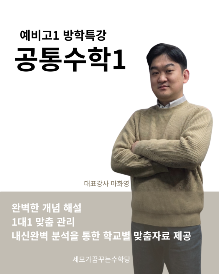 고등수학의 출발선, 이번 겨울에 정확히 세웁니다 고등수학은 양이 많아서 어려운 게 아니라, 구조를 모르고 시작해서 어려워집니다 공통수학1은 고1 내신은 물론 이후 미적분, 확률과 통계까지 이어지는 고등수학의 뼈대입니다 이번 겨울, 세모가꿈꾸는수학당은 공통수학1을 빠르게 넘기는 수업이 아니라, 제대로 세우는 수업을 준비했습니다 세모가꿈꾸는수학당 공통수학1 특강의 핵심 ①자체교재 × 판서 수업 귀에 콕콕 박히는 설명 단순 문제 나열이 아닙니다 왜 이 개념이 필요한지, 어떤 사고 흐름으로 문제를 풀어야 하는지 →판서 중심으로 구조를 잡아주는 수업 공식 암기가 아니라 이해 → 적용 → 검증이 자연스럽게 이어지도록 설계....... <img src="https://blogthumb.pstatic.net/MjAyNTEyMjNfMjg2/MDAxNzY2NDczMTIyMDc5.0OP-eCNk5pItuJu9nU5qhC1CuBqt9hJlgd2cYBi5kY0g.FQfKLlYhKLgjVuQO5VH7rOa98rlZ5RqN0HAvw0P4ge4g.PNG/900%A3%DF%BF%B9%BA%F1%B0%ED1_%B9%E6%C7%D0%C6%AF%B0%AD%A3%DF20251223%A3%DF155829%A3%DF0000.png?type=s3" />