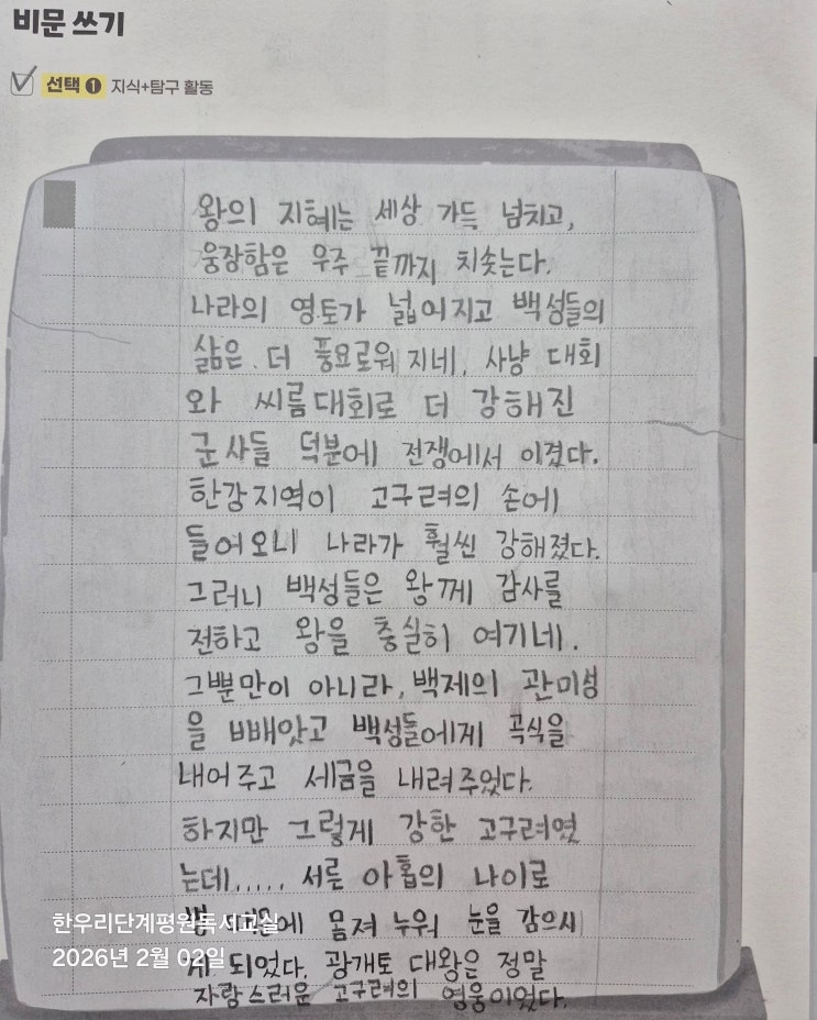 4학년 아이들이 한국사 수업을 하고 있습니다. ★1주차: 한국사 관련 책 읽고 수업 ★2주차: 교과 관련 책 읽고 수업 ★3주차: 토의/토론 ★4주차: 문학 책 읽고 수업 2월에 읽은 책은 <삼국의 영웅>이었습니다. 삼국의 전성기에 대해 수업을 한 후, 고구려 광개토대왕에 대한 비문을 썼습니다. 쉽지 않은 글쓰기인데 훌륭하게 잘 써 내서 내심 놀라웠습니다^^ 다음에는 어떤 글을 쓸지 기대됩니다! 수업 문의) 010.2282.3548 오픈 카카오톡 <img src="https://blogthumb.pstatic.net/MjAyNjAzMTJfMTk2/MDAxNzczMjk1MDA3MjI3.hRENJ-96bvqPrBqxHeY6DtMIPDlGhjReVmnGpCDGWWUg.OtAbFmcvu1IfJMM2c_Ri9Wppj4c2BJC773ygObukT2Eg.JPEG/KakaoTalk_20260312_145448200.jpg?type=s3" />