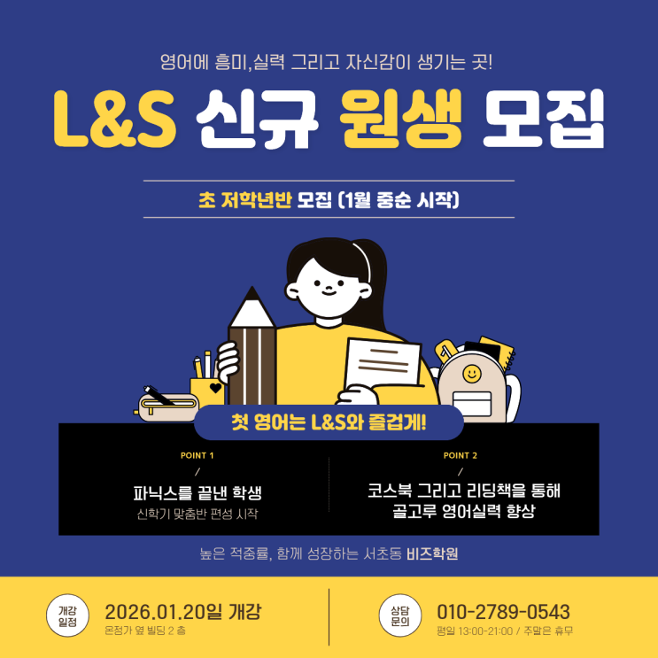 안녕하세요, 엘앤에스 영어학원입니다. 요즘 아이들 방학을 앞두고 특강 준비에 바쁜 나날들을 보내고 있습니다. 사립초 아이들은 기말고사도 다 끝났고 이제는 마지막 영어말하기 대회가 남았네요. (고생했다 애들아 ㅠㅜ) 오늘은 다름아닌 1월달에 초등학교 저학년 반 인원 모집을 알려드리기 위해서 포스팅을 해요. 상담문의 오신 분들 중에서는 영어로 수업하는 것은 참 좋은데 처음부터 영어 유치원이나 체계적으로 영어 공부를 해오지 않은 친구들에게는 진입장벽이 너무 높다는 의견이 있었어요. (저도 동감합니다). 그래서 엘앤에스에서 영어를 아직 잘 모르는 친구들에게 기초부터 가르치는 반을 개설하면 좋을 것 같다고 말씀하셨어요....... <img src="https://blogthumb.pstatic.net/MjAyNTEyMTFfNzUg/MDAxNzY1NDE1MjMyOTY4.mMjP2hT36XVK0gT4xD4hZXrDgwKCXTZSP_PP1Th8_iMg.Dxfi0GxAvLJuPrj1vCTMGSF6ab0MGkwu_WhYtfkZUkMg.PNG/%C1%A6%B8%F1%C0%BB_%C0%D4%B7%C2%C7%D8%C1%D6%BC%BC%BF%E4..png?type=s3" />