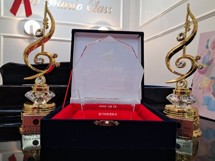 안녕하세요 우수 지도자상 수상 소식 전합니다 [경기 아트 뮤직]에서 주최한 콩쿠르에서 좋은 성적을 거둔 학생들을 지도한 공로로 우수 지도자상을 수여받게 되었습니다. 이렇게 뜻깊고 귀한 상을 받게 되어 감사한 마음이 큽니다. 이번 상패는 단순한 결과가 아닌, 그동안 제가 흘려온 피와 땀, 그리고 아이들과 함께한 시간과 노력에 대한 의미 있는 보상이라고 생각합니다. 음악이라는 한 분야에 국한되지 않고, 아이들이 다양한 영역에서 성장할 수 있도록 고민하고 지도해 온 과정이 인정받은 것 같아 더욱 뜻깊습니다. 무엇보다도 이 모든 과정은 많은 학부모님들의 신뢰가 있었기에 가능했습니다. 보내주신 믿음에 보답할....... <img src="https://blogthumb.pstatic.net/MjAyNjAxMTBfNyAg/MDAxNzY4MDMxMTg5ODMx.NmXdtT_XG_C1yrTTQCS8ks9NvrWGI35yfb2a3yTHeXEg.ydXGtqwnyRbjVcrSa5NSOPMeZHMSSxjcYVcVa9m3Xgog.JPEG/900%A3%DF20251231%A3%DF135308.jpg?type=s3" />