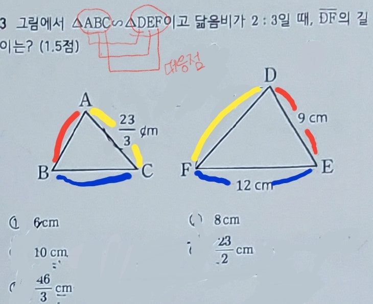 수학샘 실비아가 리뷰해줄게 닮음, 닮음비 이번 시험에서는, 난도는 낮지만 개념을 정확히 적용하지 않으면 어이없게 틀리는 문제가 있어서 소개한다. A-B-C와 대응하는 꼭지점이 D-E-F 이고, 대응 순서에 주의하라. 위 그림과 같이 같은 색끼리 대응한다. 즉, 선분DF 와 대응하는 변은 선분AC 이다! (AB 아님!) 닮은 도형에서 대응점, 대응변, 대응각을 헷갈(릴 수가 있냐!?)리면 안된다. 성적 상위권이든 하위권이든 상관없다. 문제에 집중이 흐트러지거나, 빠르게 대충 읽고 답만 찾으려고 하면 아무리 쉬운 문제라도 오히려 답만 피해가는 기적을 경험할 수 있다. *********** 수학적 정의 다시 보기 *********** ☆닮음 이란? = 두 도....... <img src="https://blogthumb.pstatic.net/MjAyNTEyMThfMjg3/MDAxNzY2MDMwOTg2ODY2.C2eh3KCjqRreyvUzVqLMpxGyQCHyzw7gHJ9QT3UPI90g.Q7FXWNkdkHToRMlQkrwuGrub4msDCqWx0-G-fOV0JXEg.JPEG/PENUP_20251218_125700.jpg?type=s3" />