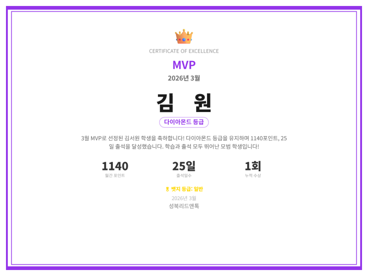 안녕하세요, 성북리드앤톡영어니다. 3월 한 달 동안 열심히 학습하고 꾸준히 출석한 우수 학생들을 선정하여 시상했습니다. 매달 포인트, 출석, 등급을 종합하여 가장 뛰어난 성과를 보인 학생들에게 상장을 수여하고 있습니다. 3월 MVP 김O원 (다이아몬드 등급) 월간 포인트: 1,140P | 출석: 25일 학습과 출석 모두 최고 수준을 기록하며 당당히 3월 MVP로 선정되었습니다! ⭐ 3월 우수학생 김O경 (플래티넘 등급) 월간 포인트: 920P | 출석: 21일 이O후 (플래티넘 등급) 월간 포인트: 732P | 출석: 16일 한O조윤 (골드 등급) 월간 포인트: 809P | 출석: 13일 매일 꾸준히 학습하고 성실하게 출석한 결과가 멋진 성과로 이어졌습니다. 선정....... <img src="https://blogthumb.pstatic.net/MjAyNjA0MDFfNTEg/MDAxNzc0OTcyMDY2MTEz.TaPvij_65N78fREGTRYJ1v9PqoB9mj2k3dWXeavBzxAg.RClpBRQclECC-x5YZRFWW4VhPjgy0rA_mgShoEBwQRgg.PNG/%BB%F3%C0%E5_%B1%E8%BC%AD%BF%F8_2026%B3%E23%BF%F9_MVP1.png?type=s3" />