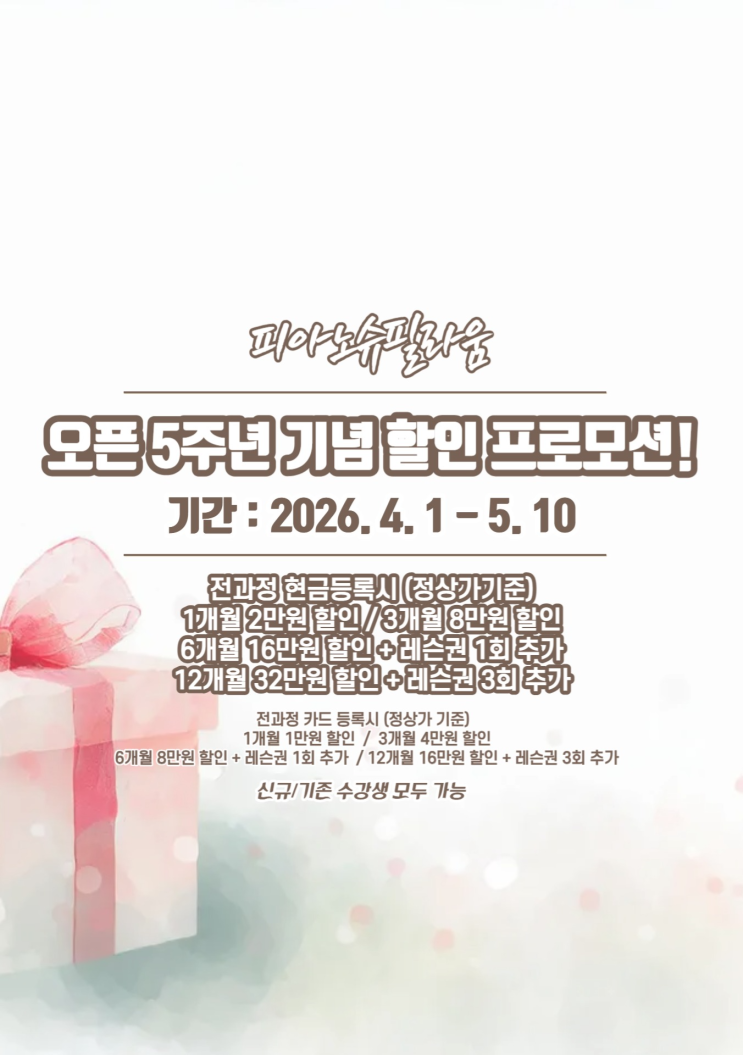 #성북구성인피아노 #피아노슈필라움 피아노 슈필라움이 5주년을 맞게 되었습니다. 감사합니다! 5주년을 맞이하여 특별히 프로모션 기간을 기존보다 길게 진행합니다. 할인 프로모션 적용가능 기간 2026년 4월 1일 - 5월 10일 (40일간) 전과정 현금등록시 할인가(정상가 기준) 1개월 등록 2만원 할인 3개월 등록 8만원 할인 6개월 등록 16만원 할인 + 레슨권 1회 추가 12개월 등록 32만원 할인 + 레슨권 3회 추가 *카드결제도 할인은 가능하지만, 할인율이 낮습니다. -전과정 카드등록시 할인가(정상가 기준) 1개월 등록 1만원 할인 3개월 등록 4만원 할인 6개월 등록 8만원 할인 + 레슨권 1회 추가 12개월 등록 16만원 할인 + 레슨권 3회 추가 *신....... <img src="https://blogthumb.pstatic.net/MjAyNjA0MDFfNzIg/MDAxNzc1MDMzNDM4MTg4.pUbAoJ9MSQJIDqCSs9NsDe7ZGcnkez8MNWr4GAzQ3Zkg.OPcs8cnL_PhS47AJzOrHE9cF2q6MwiFtjeR2s1l5-t4g.PNG/5%C1%D6%B3%E2%C7%C1%B7%CE%B8%F0%BC%C7.png?type=s3" />