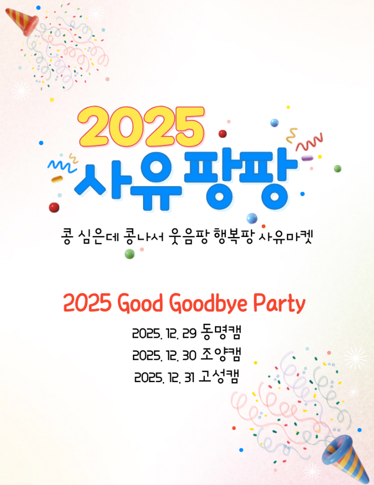 안녕하세요, 사유에듀학원입니다! 어느덧 2025년의 마지막 달력이 한 장 남았습니다. 올 한 해, 우리 사유에듀 친구들은 그 어느 때보다 뜨겁게 공부하고, 치열하게 성장했습니다. 일 년 동안 고생한 우리 학생들을 위해, 사유에듀가 아주 특별한 하루를 준비했습니다. 이름하여 <2025 사유팡팡 : Good Goodbye Party> 입니다! 맛있는 간식과 즐거운 이벤트, 그리고 친구들과 함께하는 소중한 추억까지! 공부할 땐 확실하게 공부하고, 놀 땐 확실하게 노는 사유에듀의 화끈한 송년 파티를 위해 선생님들께서 열심히 준비했습니다. 각 캠퍼스별로 파티가 진행되는 날짜가 다르니, 우리 친구들은 해당 일정을 꼭 확인해 주세요! ?....... <img src="https://blogthumb.pstatic.net/MjAyNTEyMjhfMTMx/MDAxNzY2OTI2ODA5MjQy.-z0AEIzZ3EUT_daCmDKjCG9h5tJfyI5u-Hhv5kCTWV4g.0SHBXb_EPBeciV8CTQTQ8yuKKYbnKu4-A_t3gWi0CPEg.PNG/%C1%A6%B8%F1%C0%BB_%C0%D4%B7%C2%C7%D8%C1%D6%BC%BC%BF%E4.png?type=s3" />