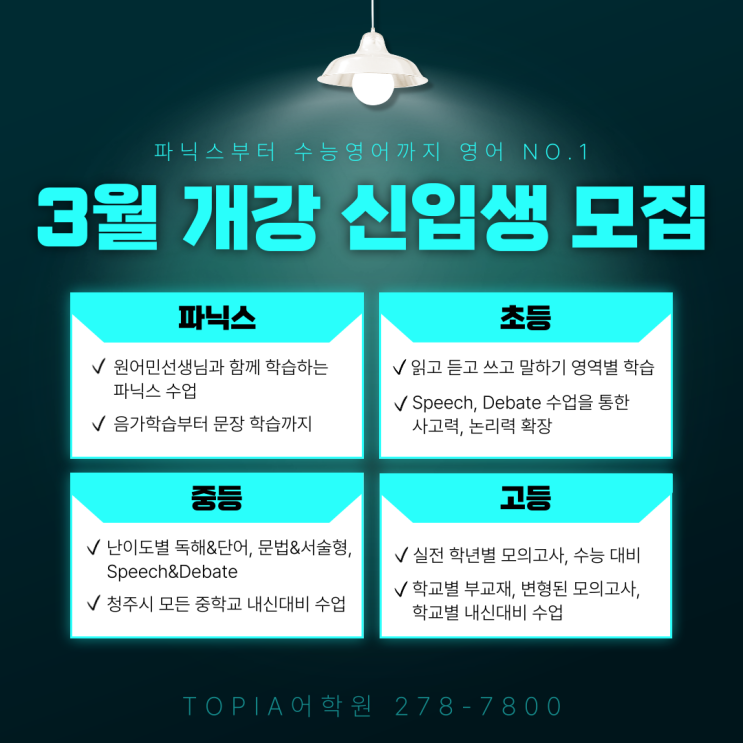 안녕하세요, TOPIA어학원 서청주캠퍼스입니다. 벌서 2026년 새해가 밝은지 얼마 된것 같지 않은데 1월이 지나 2월입니다 ~ 곧 다가올 3월에는 새학기가 시작이 되는데요. 토피아어학원에서도 3월학기 준비가 시작됩니다! 파닉스부터 수능영어까지 NO.1 TOPIA어학원 ✅ 초등부 파닉스부터 최상위 영재반까지 알파벳을 모르는 학생을 위한 파닉스반부터 중,고등 어학수준을 아우르는 최상위반까지 모든 반 개설!! 파닉스 단계부터 원어민선생님과 함께 수업하며 Speech, Debate 수업을 통해 배경지식을 습득하며 사고력을 확장하고 나의 주장을 정확한 근거를 토대로 논리력을 향상 시킵니다. https://blog.naver.com/topiascj/224106417363 ✅....... <img src="https://blogthumb.pstatic.net/MjAyNjAyMDVfNTUg/MDAxNzcwMjc0MDgzOTMw.zUxh34MrFCPOyrznp1oHdXWb2jTuaEBB14pXQPvypJUg.k1oTUQ-v5fyBoID_MWxYMshXr9EPf4SsDxV-wgnQZ9kg.PNG/002.png?type=s3" />