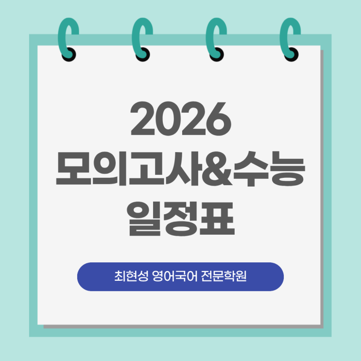 안녕하세요~ 최현성 영어국어 전문학원 최원장입니다. 2026년 모의고사&수능 일정입니다. 초6부터 고3까지 내신부터 수능까지 문법기초부터 심화독해까지 노베이스에서 최상위까지 제대로 가르칩니다. 교육상담 236. 0579 010. 4739. 2550 문자&톡 상담가능 교육청 등록번호 : 제 4582호 교습과목 : 영어, 국어 영어 교습비 : 19~32만원 국어 교습비 : 10~20만원 <img src="https://blogthumb.pstatic.net/MjAyNTEyMTBfOTQg/MDAxNzY1MzUwMDAzMTQz.dhpXrc3EK7WJKTO1A_bZmsjpAndftPeeo5MihJwjYWkg.fMS4UE8yFvnChtxqnZyI_K5lWx0-MdOVvgW1-VZj0TYg.PNG/%C0%D4%BD%C3%C1%A4%BA%B8.png?type=s3" />
