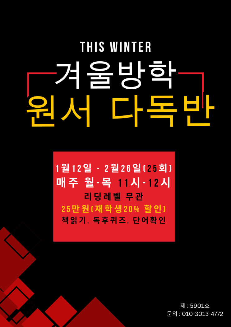 안녕하세요, 키움 영어 써니쌤입니다. 겨울방학이 한 달 안쪽으로 다가왔습니다. 이번 겨울방학을 알차게 보낼 특강 수업 및 신규 개설 수업 안내드립니다. 방학 특강 : 26년 1월 12일 ~ 2월 26일 (매주 월-목요일 총 25회 / 원서다독반, 중학문법 몰입반) 신규모집반 : 26년 1월 12일 시작 (매주 월-목 파닉스 반 / 매주 금요일 원서 정독반) 사진을 보시고 수업에 대한 궁금한 점은 원으로 연락 주세요. <방학 특강> 1월 12 ~ 2월 26일 (설 연휴 휴강) <신규 모집반> 1월 12 ~ (설 연휴 휴강) <오시는 길> <img src="https://blogthumb.pstatic.net/MjAyNTEyMTdfMTEy/MDAxNzY1OTQzNjEwMjI1.HK4g5KymtOLpRdOOWHPZaxTCncgXcFi8ysugk64Cgw4g.kSaZf-6YYZKRHhbgVRZjBFHmtnlf3kM-d19SVqBsFC8g.PNG/1.png?type=s3" />